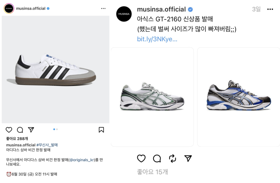 위 이미지는 무신사가 신상품 발매에 대해 인스타그램과 스레드에 각각 업로드한 게시글인데요. 스레드 계정에서는 신상품 발매 기획전 페이지 링크를 연결해서 적극적으로 홍보하고 있어요. 기존에 운영하던 인스타그램 계정에서는 신제품이나 입점 브랜드에 대한 단순 정보 전달 콘텐츠를 정제된 형태로 발행해 왔거든요. 하지만 새롭게 만든 스레드 계정에서는 더 가볍고 캐주얼한 말투를 사용하고 있죠. 이외에도 무신사 구내식당 메뉴, 직원들의 일상적인 모습 등 다양한 콘텐츠를 업로드하고 있어요.