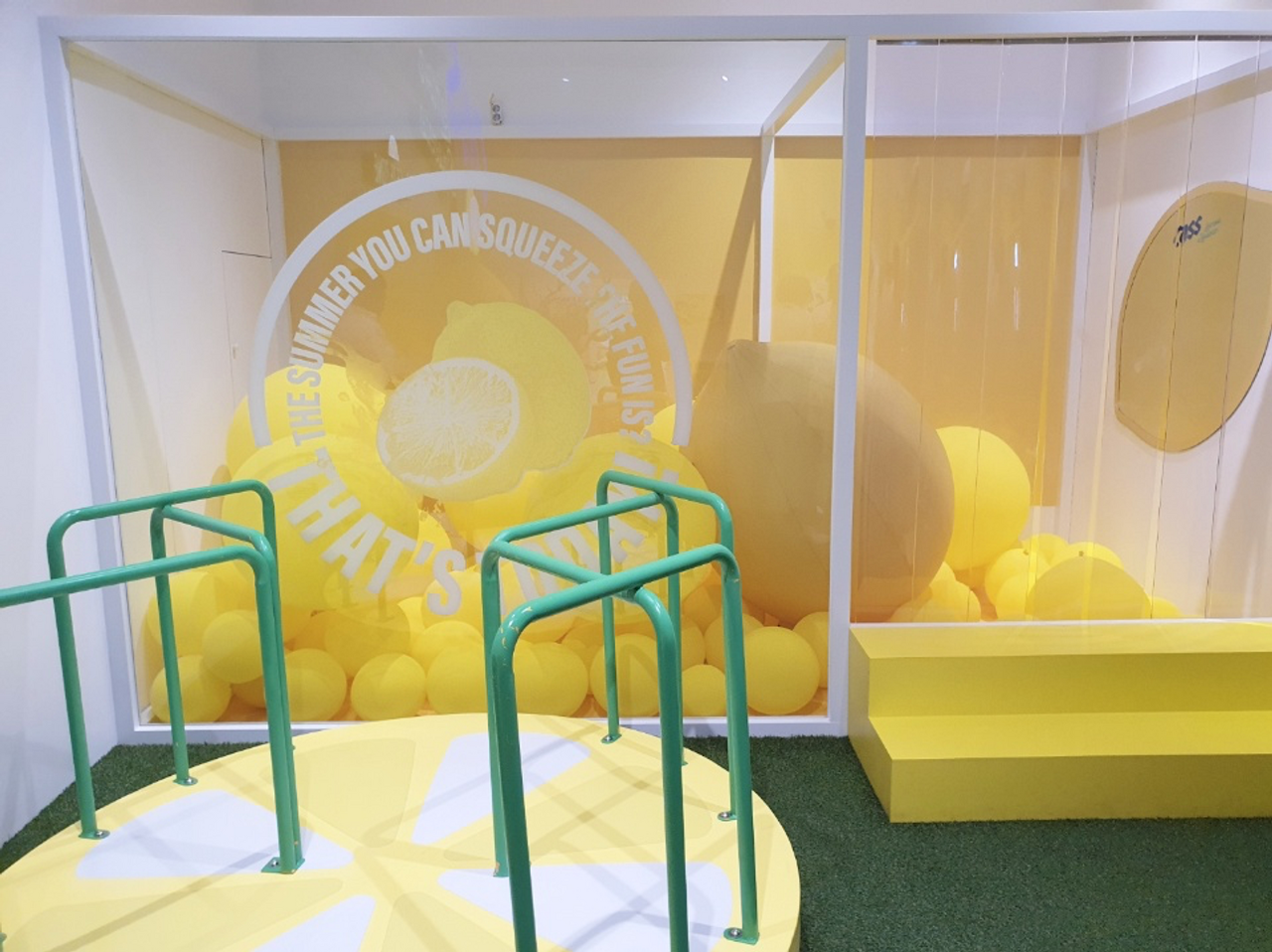 팝업스토어에서 인증사진을 빠뜨릴 수 없겠죠? 놀이기구 뒤쪽에 보이는 곳이 바로 포토존인데요. 노란 풍선이 가득한 곳에서 자유롭게 사진을 찍을 수 있었어요. 샛노란 풍선만으로도 레몬이 연상되는 포토존이었어요.
