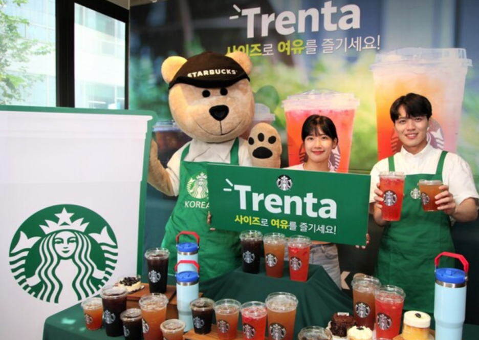 스타벅스에서 아시아 국가 최초로 한국에서 초대용량 '트렌타' 사이즈를 출시했어요. 트렌타는 이탈리아어로 숫자 '30'을 뜻하는데, 30온스, 약 887ml의 용량을 말합니다. 스타벅스는 국내에서 트렌타 사이즈를 9월 30일까지 기간 한정으로 판매한 후 확대 판매를 검토할 예정이라고 해요. 스타벅스뿐만 아니라 최근 식음료업계에서는 자이언트, 점보 등 빅사이즈 제품이 유행하고 있습니다. GS25는 초대형 컵라면인 점보 도시락을 출시했는데, 출시 3일 만에 5만 개의 물량이 품절되었죠.