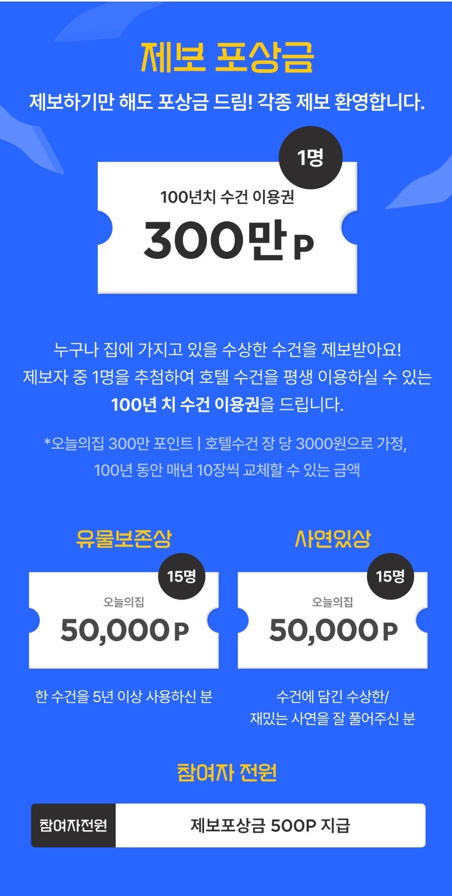 이벤트 당첨 혜택도 풍성하고 재미있는데요. 추첨을 통해 제보자 중 1명에게는 100년 치 수건 이용권에 달하는 ‘오늘의집 300만 포인트’가 수여됩니다. 호텔 수건을 장당 3000원으로 가정했을 때 매년 10장씩 100년간 교체할 수 있는 비용에 해당한다고 하네요! 한 수건을 5년 이상 사용한 15명, 수건에 담긴 수상하고 재미있는 사연을 소개한 15명에게는 각각 오늘의집 5만 포인트가 지급되고요. 이 외에 수상한 수건을 가장 많이 제보한 5명과 이벤트 페이지를 공유한 5명에게도 5만 포인트를 지급합니다. 또 수건 제보에 참여한 참여자 전원 모두 제보포상금으로 오늘의집 500 포인트를 받을 수 있대요.