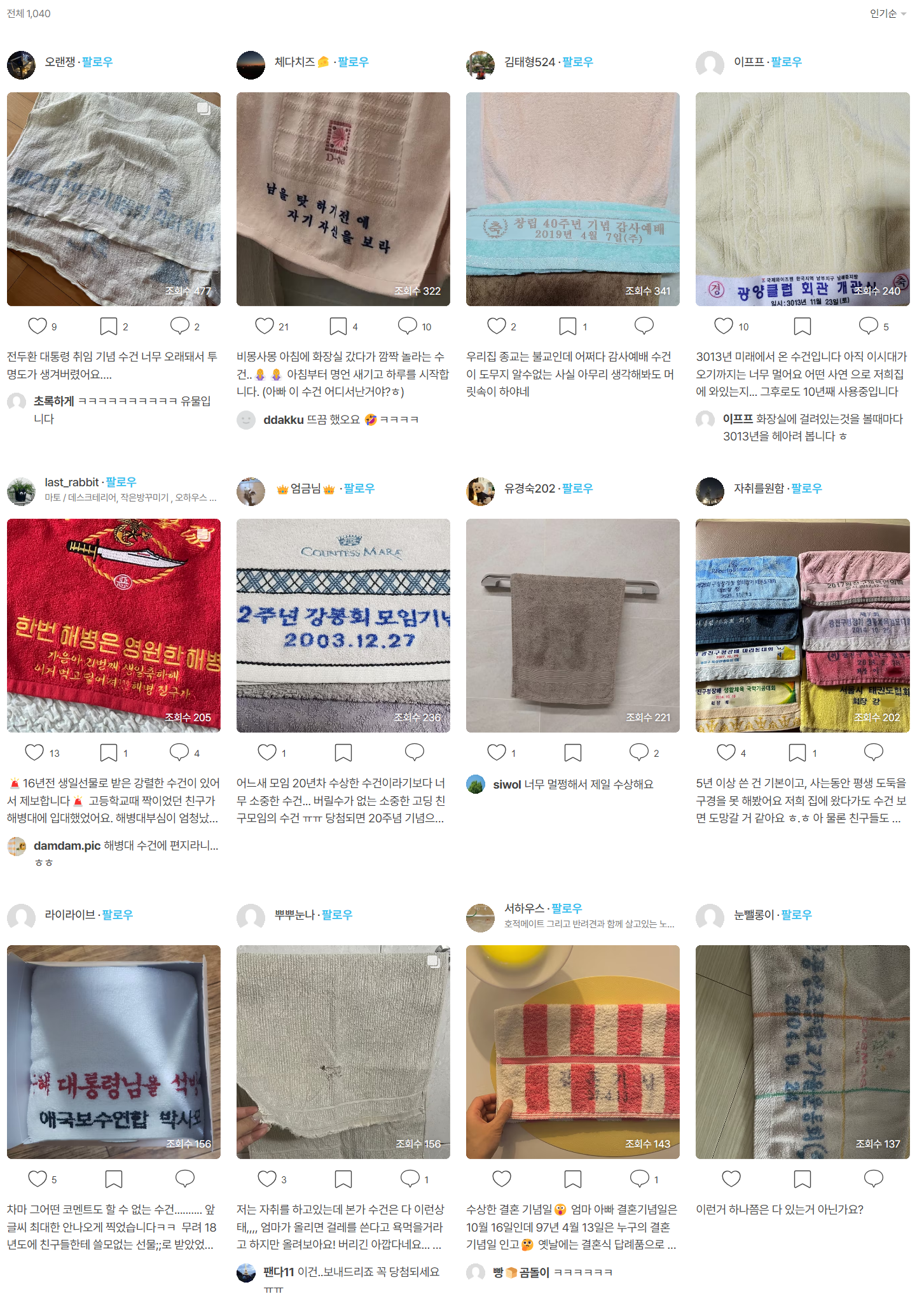 이벤트에 참여한 수건 사진들을 보니 흥미로운 것들이 많았어요. '남을 탓하기 전에 자기 자신을 보라'는 명언이 새겨진 수건, 3103년 미래에서 온 수건, 해병대 수건에 생일 축하 멘트를 적어 준 친구 등 다양한 참여작들이 오늘의집 이용자들에게 유쾌한 재미와 웃음을 선사했습니다.