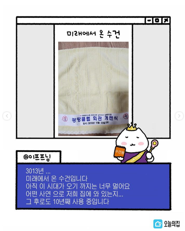 이벤트에 참여한 수건 사진들을 보니 흥미로운 것들이 많았어요. '남을 탓하기 전에 자기 자신을 보라'는 명언이 새겨진 수건, 3103년 미래에서 온 수건, 해병대 수건에 생일 축하 멘트를 적어 준 친구 등 다양한 참여작들이 오늘의집 이용자들에게 유쾌한 재미와 웃음을 선사했습니다.