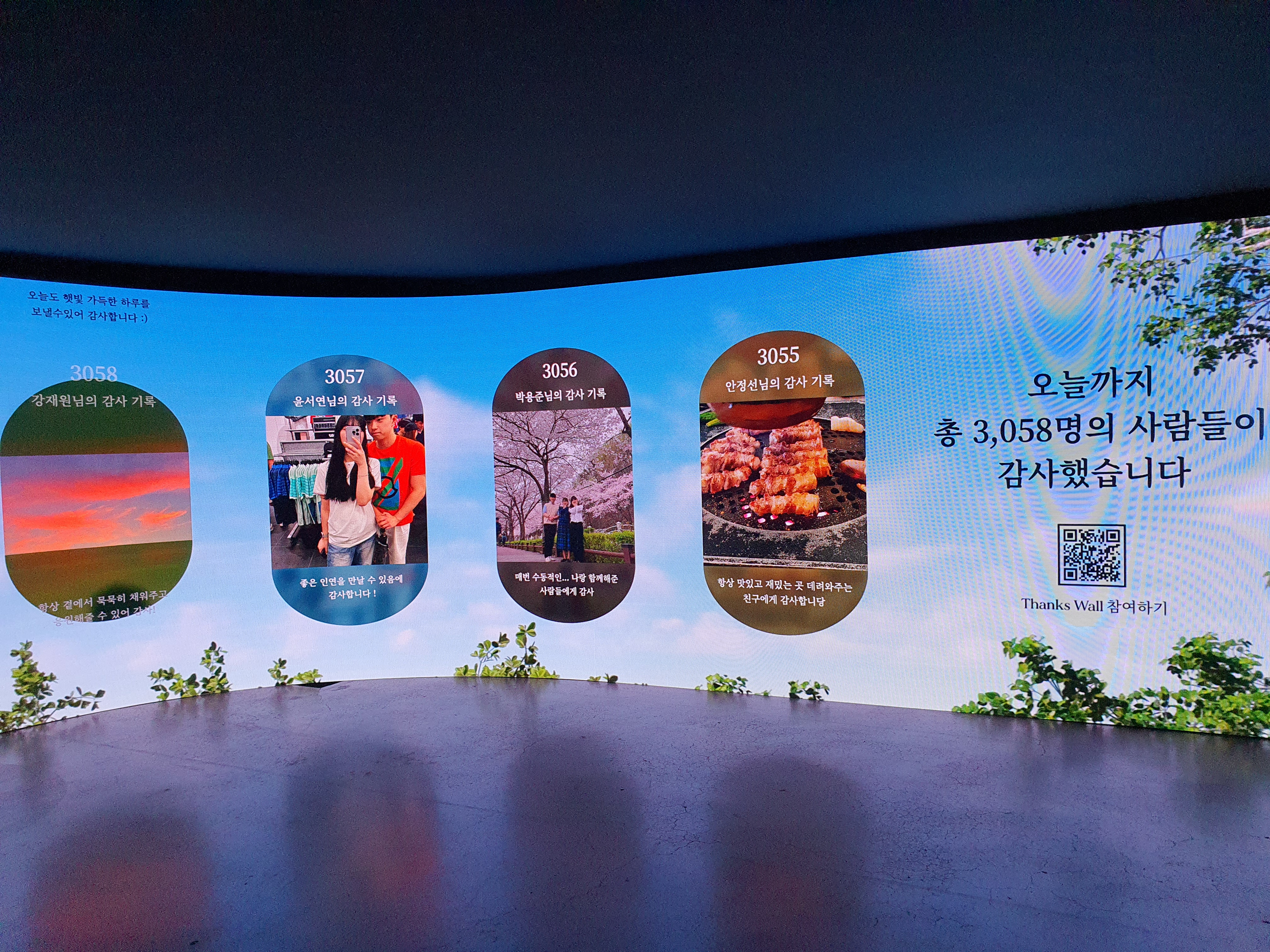 그래서 사소한 일이더라도 감사한 일을 생각해 보면서 다른 사람들과 나눌 수 있는, 화려하지 않고 담백한 공간을 만드는 게 이번 팝업의 목표였고요. 실제로 많은 사람들이 자신들만의 감사를 공유해 주었고, 스크린에 쭉 올라가면서 서로의 감사를 나눌 수 있는 감동적인 공간이었어요.