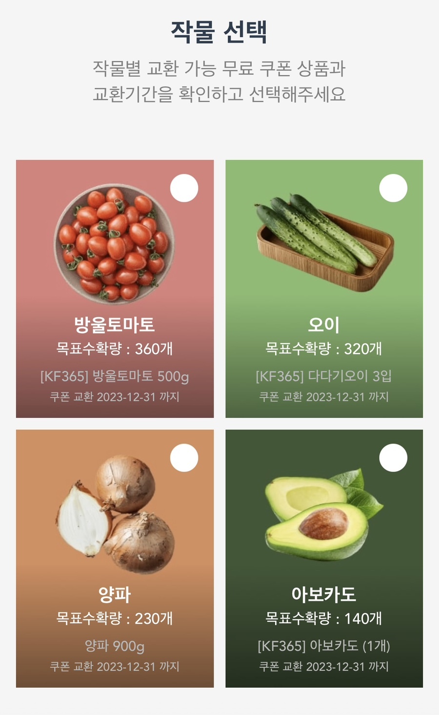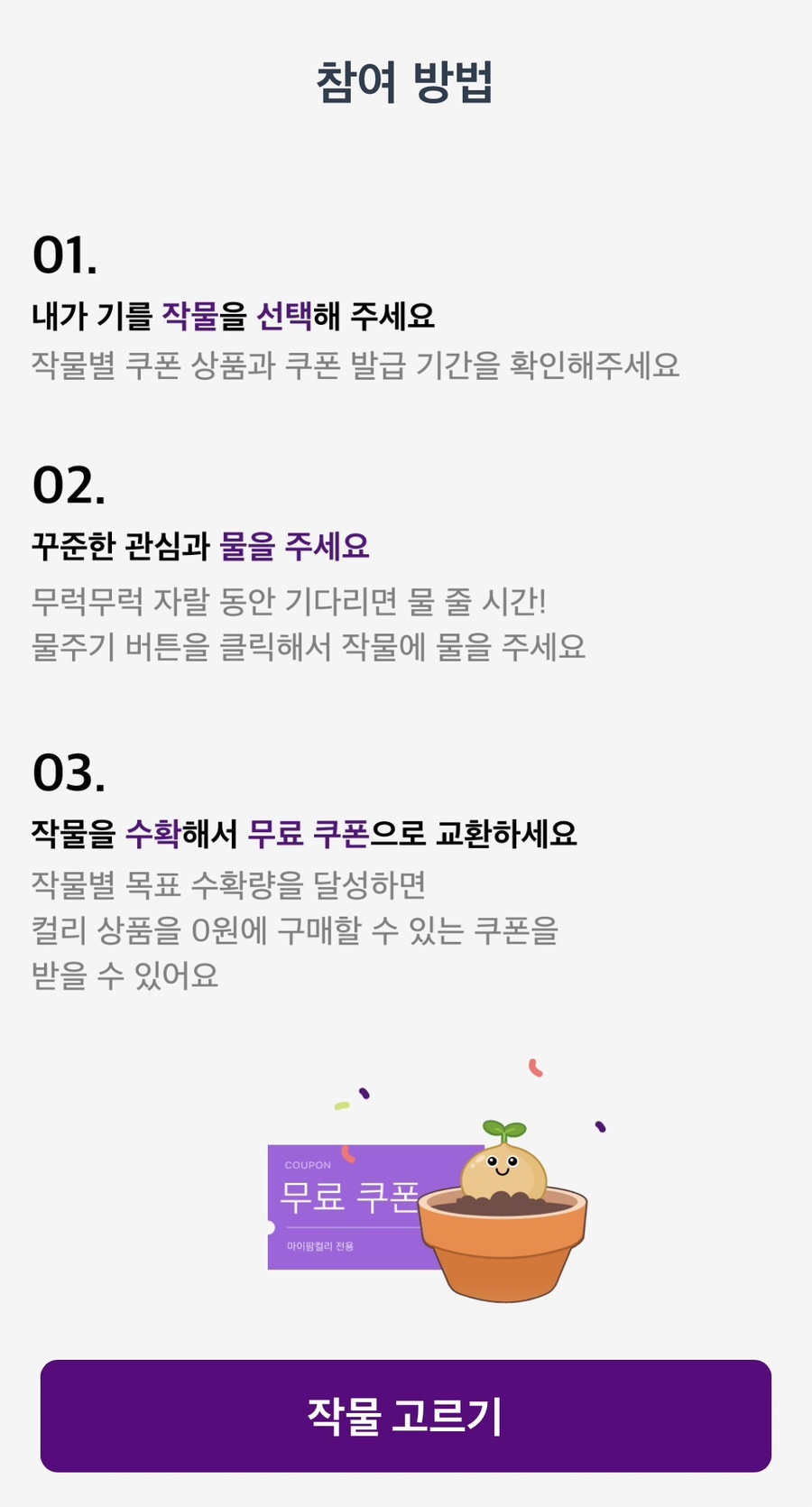 ✔️ 마켓컬리에서는 최근 앱으로 작물을 키우고 수확하면 실물 작물을 집으로 보내주는 '마이컬리팜'게임을 출시했습니다.