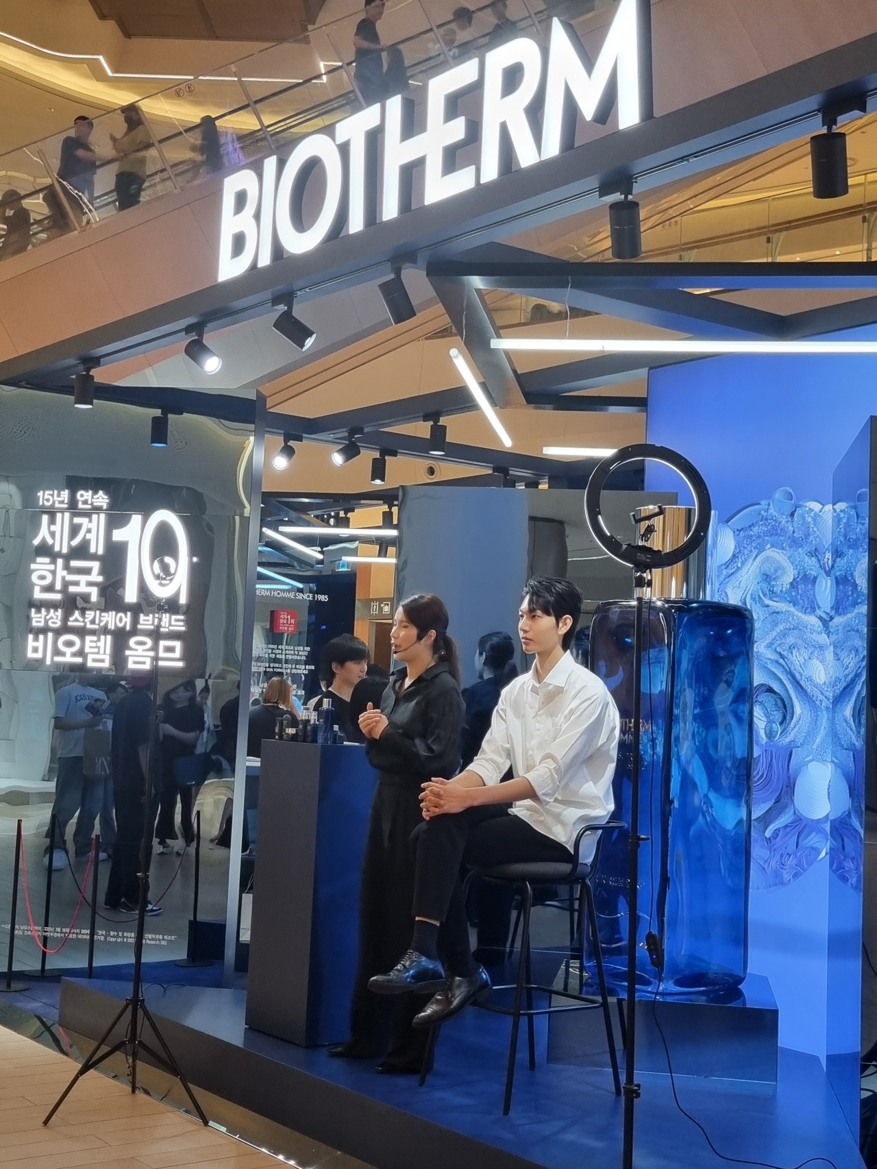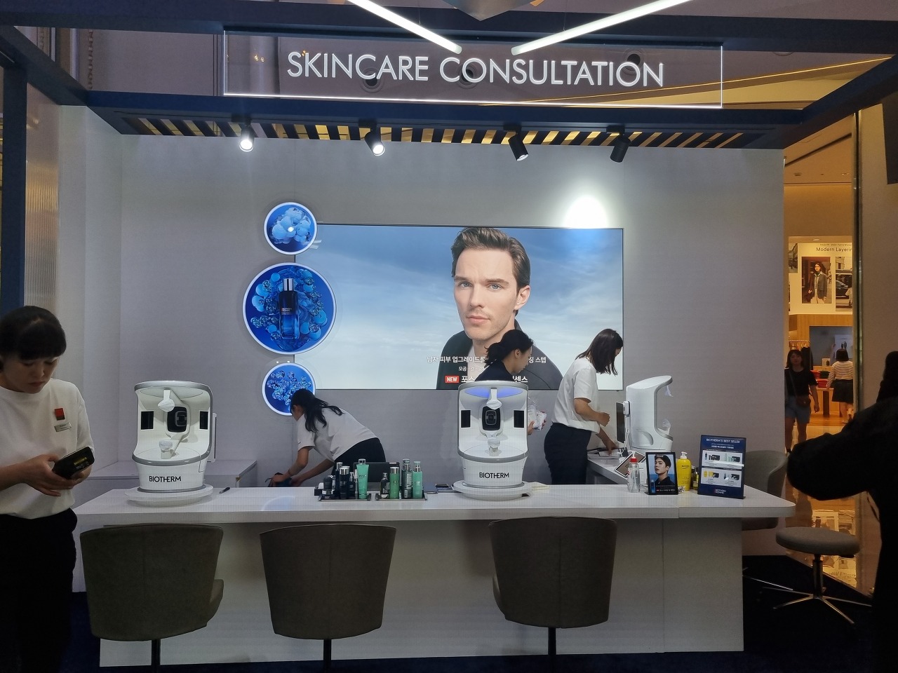 비오템 옴므가 신제품 ‘포스 수프림 필 에센스’ 출시를 기념해 롯데월드몰 1층에서 팝업스토어를 열었어요. 비오템은 프랑스의 화장품 회사로, 세계 최대 종합 화장품 회사 '로레알' 그룹에 속해있는 스킨케어 전문 브랜드예요. 비오템 옴므는 2000년대 초반부터 한국 시장에서 '그루밍족'을 타겟으로 다양한 마케팅을 선보였는데요. 그동안 다니엘 헤니, 원빈, 로운, 류준열 등의 남성 셀럽들이 비오템 옴므의 모델을 맡았고요. 2023년부터 배우 박보검이 비오템 옴므의 모델로 활동하고 있어요. 국내에서 팝업스토어를 오픈한 것은 이번이 처음인데다가 오직 남성 고객만을 위한 공간으로 꾸며져 많은 화제가 되었어요.