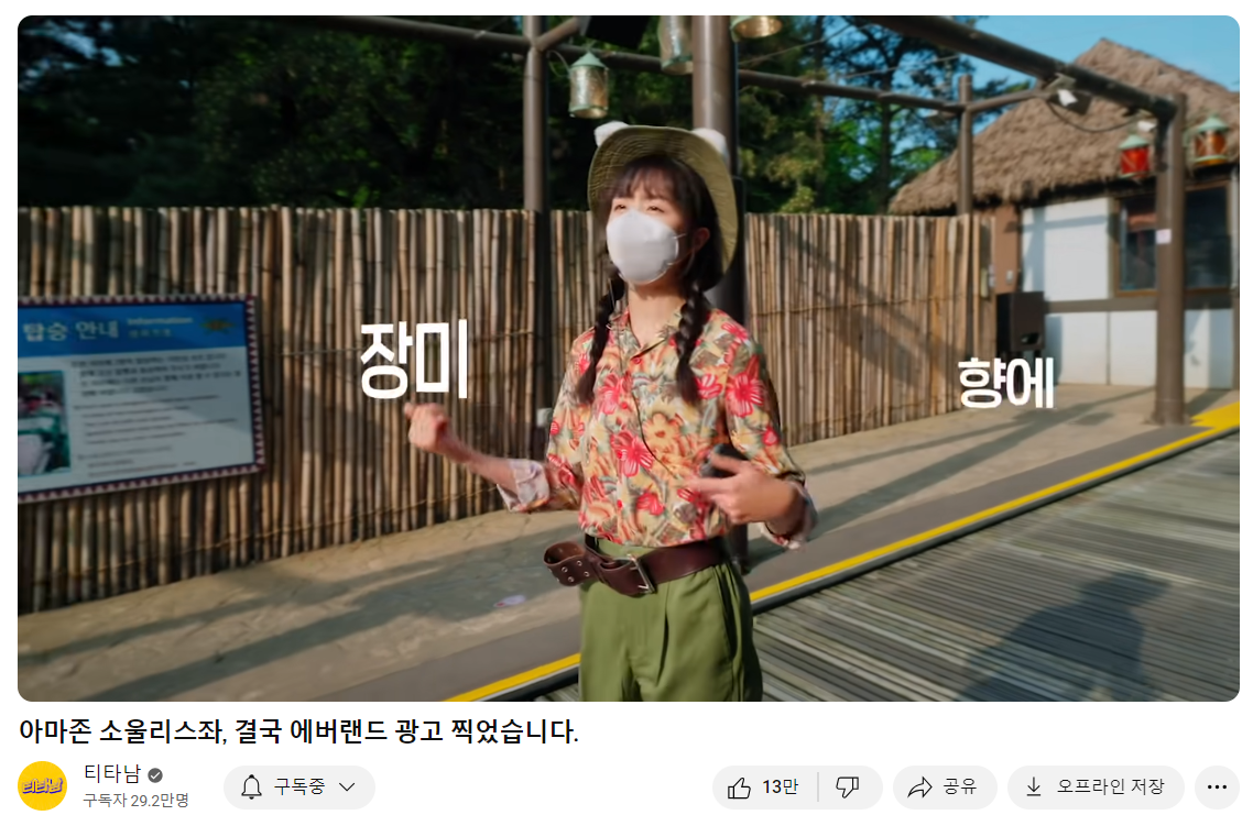 2022년 유튜브에서 큰 화제가 되었던 소울리스좌의 숏츠 영상은 티타남 채널에서 조회수 2811만회를 기록했는데요. 에버랜드 아마존 익스프레스의 캐스트였던 소울리스좌는 이후 티타남 채널에 합류해 에버랜드 장미축제 광고까지 찍게 되었어요. 에버랜드는 이런 예능 콘텐츠를 통해 에버랜드의 '찐팬'을 만들어가고 있습니다.