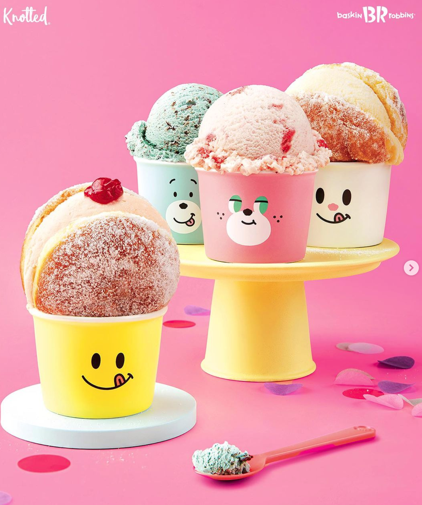 배스킨라빈스는 매달 새롭고 신선한 맛을 개발해서 '이달의 맛'으로 출시하고 있는데요. 최근 디저트 카페 '노티드(Knotted)'와 손을 잡아 8월 이달의 맛을 공개했어요. 노티드의 대표 도넛인 우유 생크림 도넛을 아이스크림으로 재탄생시켰죠. 뿐만 아니라 노티드의 시그니처인 스마일 캐릭터를 넣은 문구 세트, 미니 파우치 등 다양한 굿즈를 만들어 화제가 됐습니다.