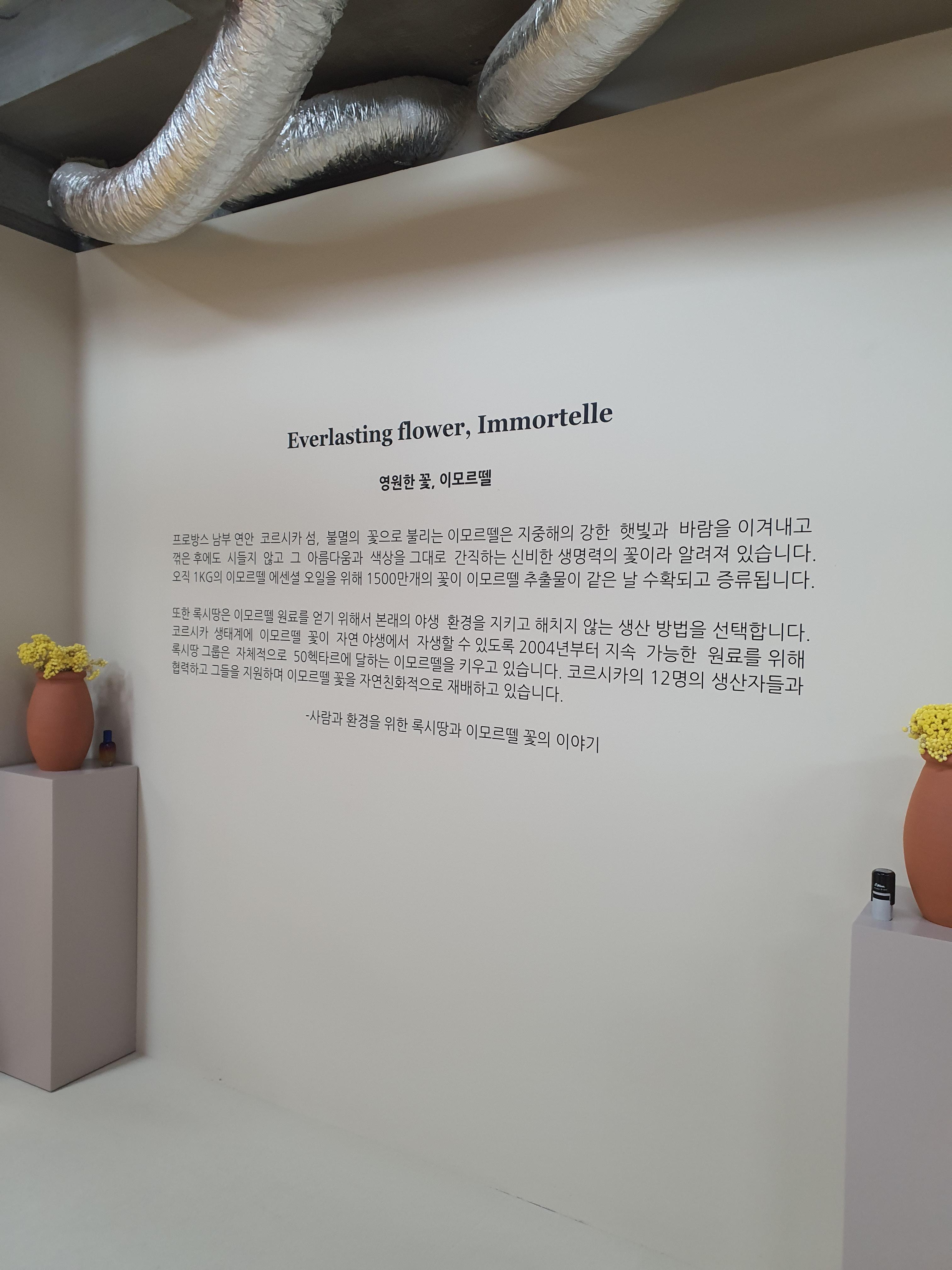 뿐만 아니라 록시땅은 환경을 해치지 않고 지속 가능하도록, 잠실 야구장 50개 크기의 부지에서 이모르뗄을 직접 재배하는데요. 코르시카 현지 생산자들과 함께 자연친화적으로 키우고 있다고 해요. 이모르뗄 캡슐존에서는 이러한 록시땅의 스토리를 들어볼 수 있게 구성이 되어 있어요. 캡슐 안에 들어가면 태블릿을 통해서 록시땅과 이모르뗄의 이야기를 들어볼 수 있고요.