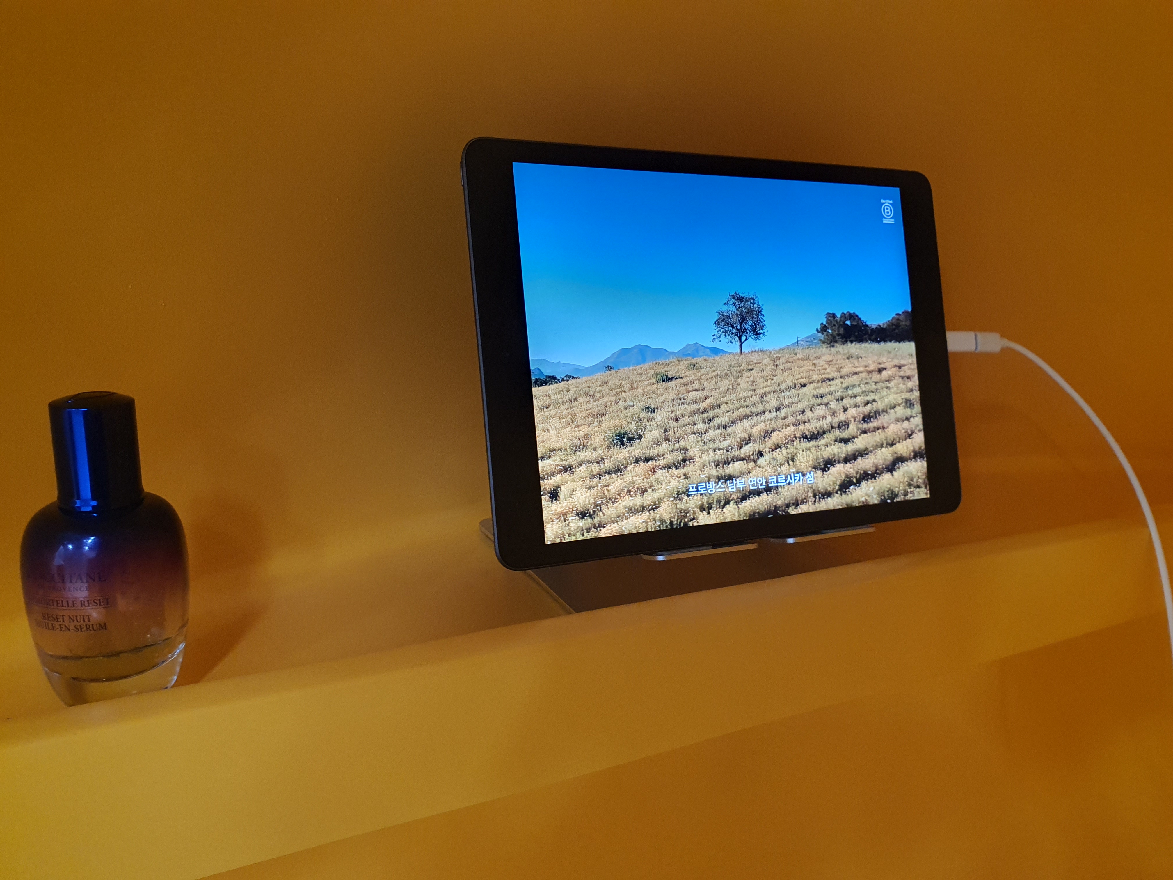 뿐만 아니라 록시땅은 환경을 해치지 않고 지속 가능하도록, 잠실 야구장 50개 크기의 부지에서 이모르뗄을 직접 재배하는데요. 코르시카 현지 생산자들과 함께 자연친화적으로 키우고 있다고 해요. 이모르뗄 캡슐존에서는 이러한 록시땅의 스토리를 들어볼 수 있게 구성이 되어 있어요. 캡슐 안에 들어가면 태블릿을 통해서 록시땅과 이모르뗄의 이야기를 들어볼 수 있고요.