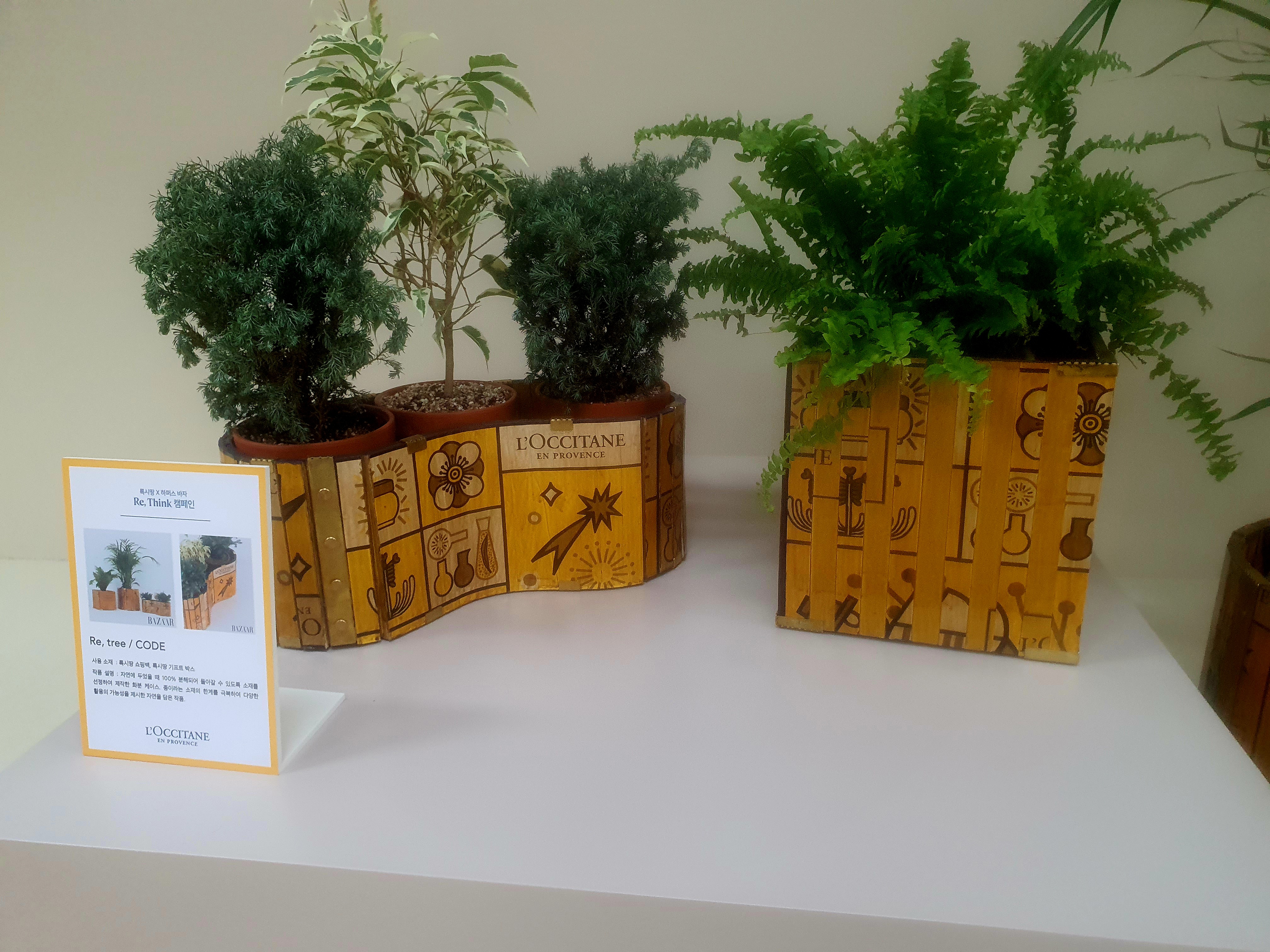 록시땅과 하퍼스바자가 콜라보한 업사이클링 작품들도 구경할 수 있는데요. 록시땅 쇼핑백을 재활용해 화분을 만든 작품이나 핸드크림으로 만든 블라인드 등이 있었어요.