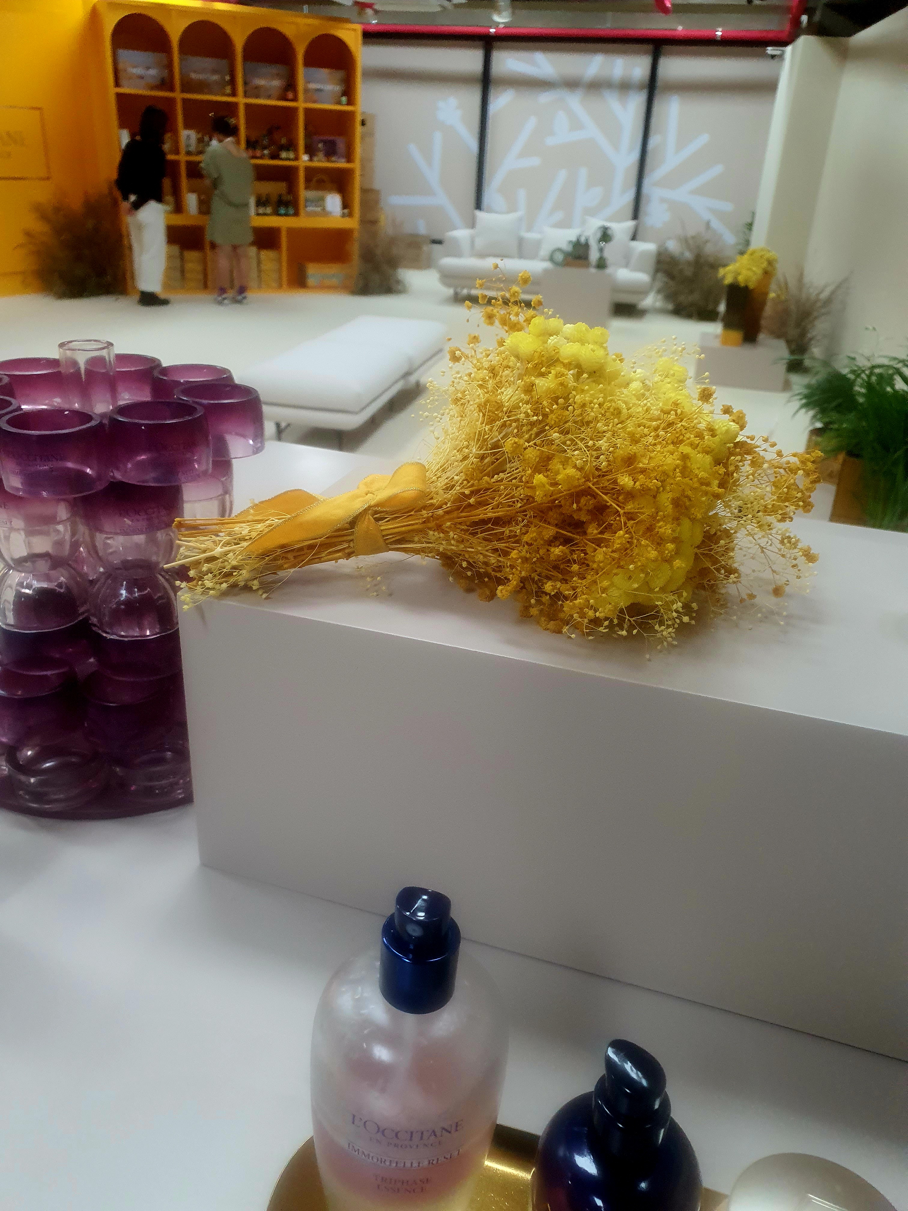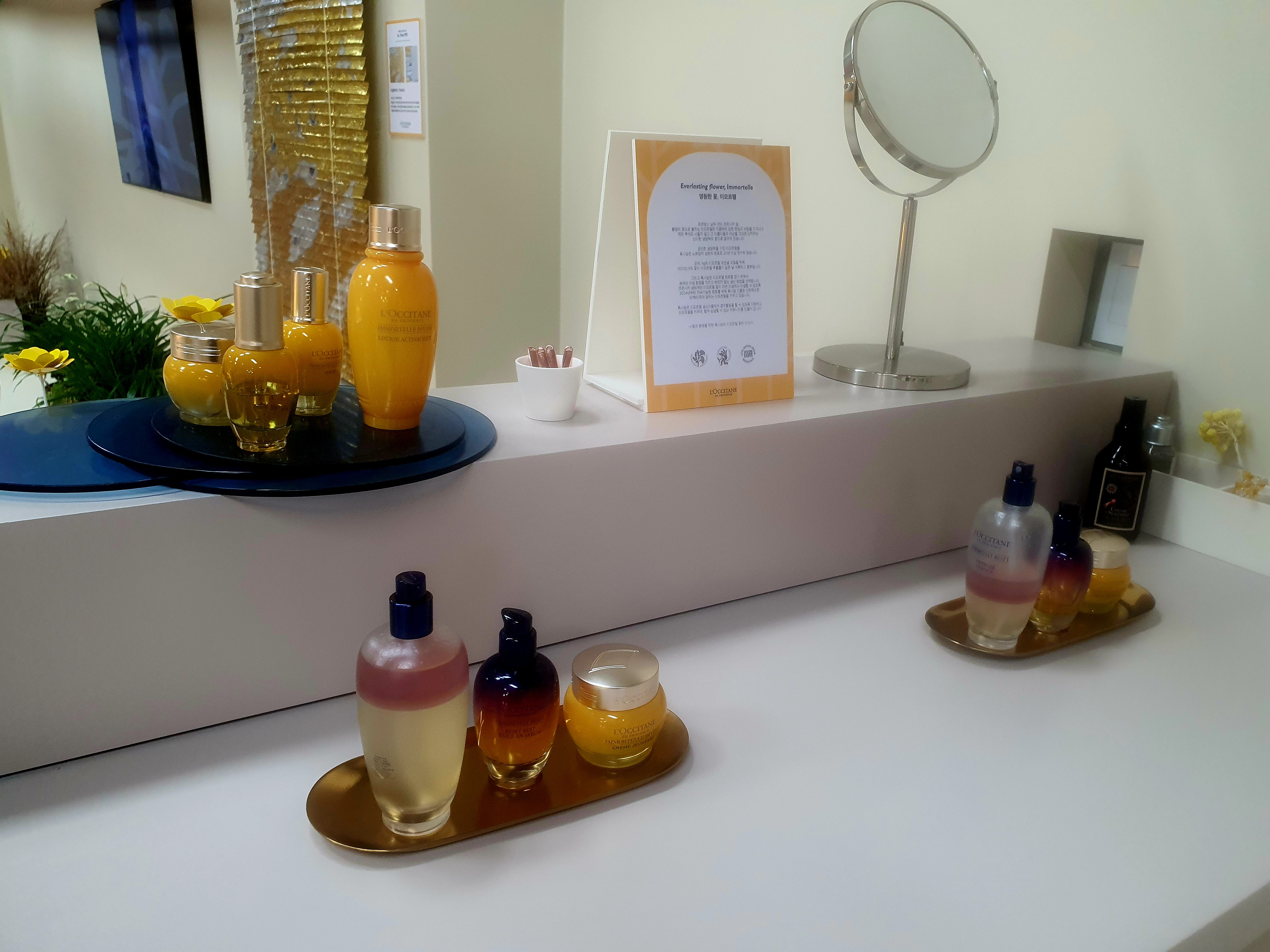 다음은 이모르뗄 제품 라인의 에센스와 세럼, 크림을 체험해 볼 수 있는데요. 제품군 모두 이모르뗄이 함유된 만큼 향이 은은하게 올라왔어요. 옆에 놓인 이모르뗄 생화와 동일한 향이 올라와서 굉장히 인상적이었어요. 마찬가지로 직원분께서 친절하게 제품의 원재료, 효능 등을 설명해 주셨고요.