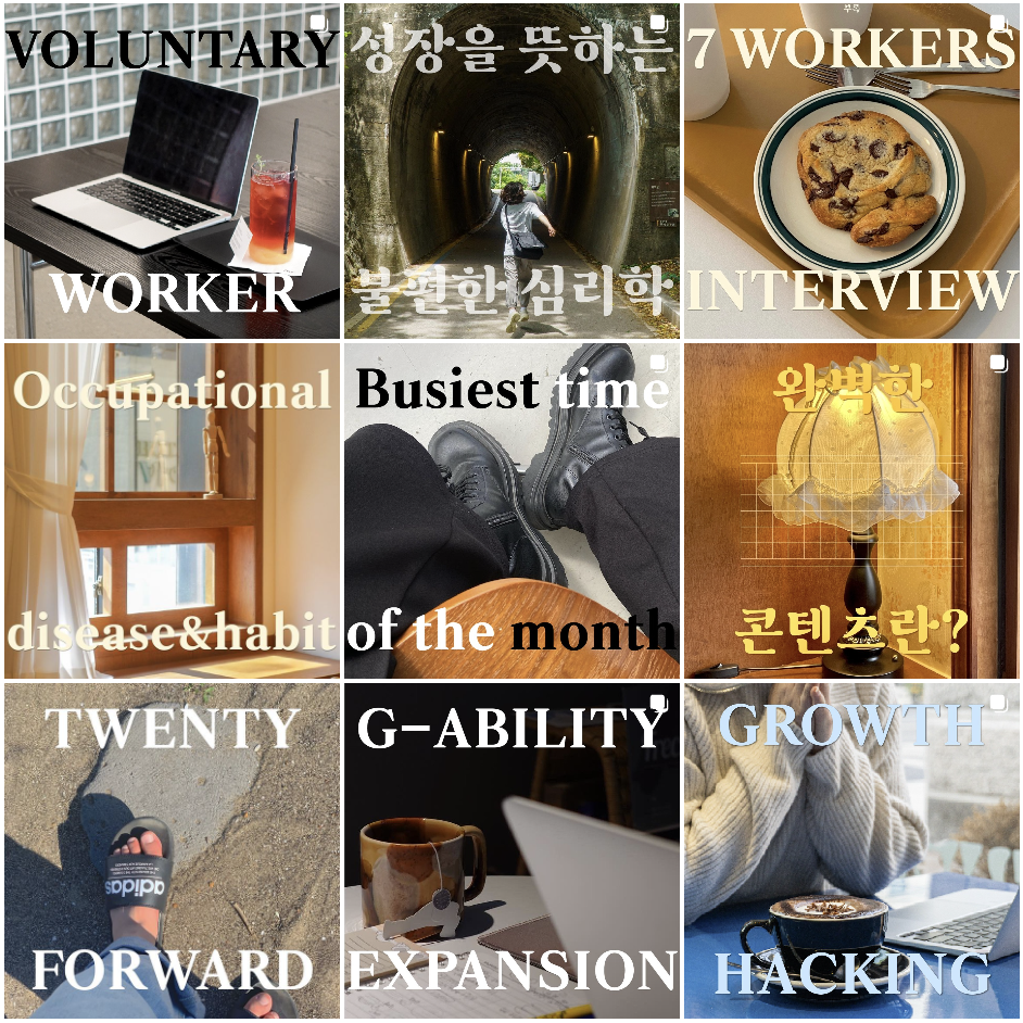 자신의 실제 경험과 인사이트를 다른 사람들과 함께 공유하기 위한 콘텐츠 계정을 말해요. 영감 기록은 경험 전 수집 단계라고 하면 이 계정은 경험 후 자신의 이야기를 기록하고, 사람들과 공유하는 목적을 가지고 있어요. 이 목적을 어떻게 설정하느냐에 따라서 자기 계발 계정이 될 수 있고, 퍼스널브랜딩이나 단순 정보성 콘텐츠 계정일 수도 있어요. 자신의 마케터 브랜딩을 가지고 있는 각각 다른 컨셉의 마케터 인스타그램을 소개할게요.