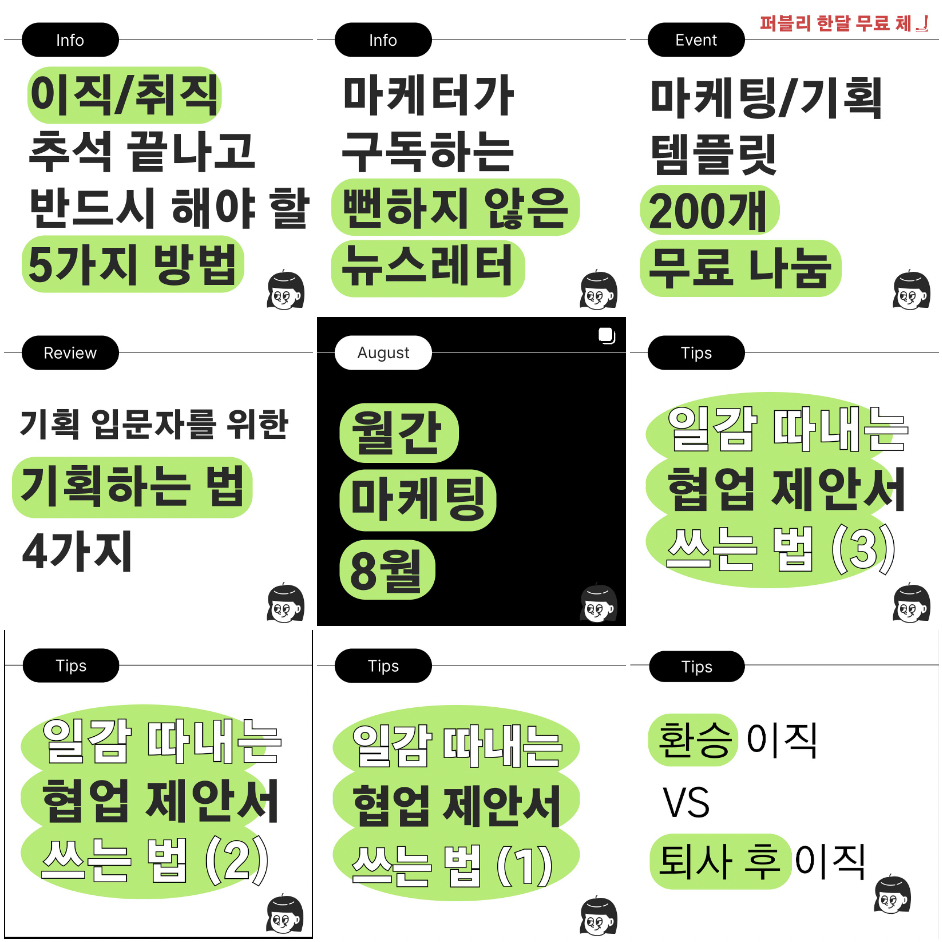 야놀자/여기어때/망티/콩카페 출신 기획 마케터로 취뽀, 랜선사수라는 키워드로 현업에 참고하기 좋은 정보와 다양한 이야기를 공유해요. 취업 준비생, 기획자라면 꼭 알아두기 좋은 계정이에요.