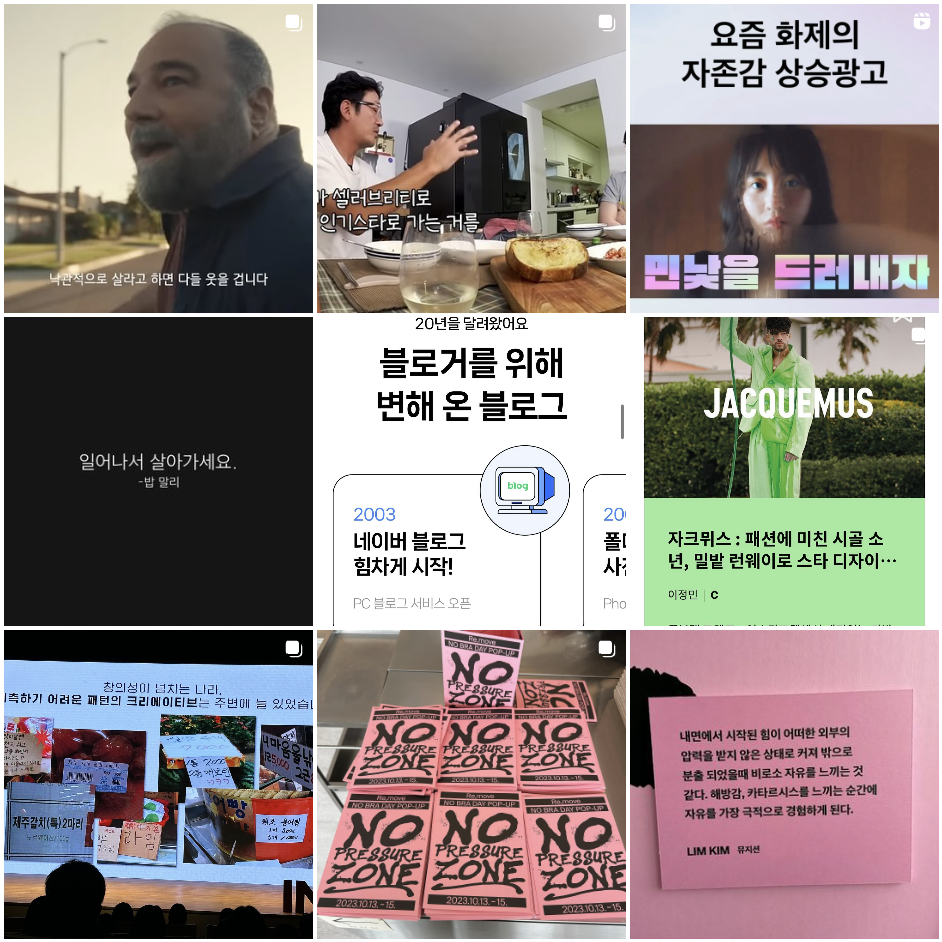 마케터의 인스타그램하면 영감 노트와 영감 계정이 가장 먼저 떠올라요. 일상 속에서 기억하고 싶은 인상적인 문구, 마음에 드는 디자인, 재치 있는 광고 글을 사진과 영상으로 모아두는 목적을 가진 나만의 아이디어 창고인 셈이죠. 마케터들 중에서도 마케터 숭님의 영감 노트 인스타그램(https://www.instagram.com/ins.note/)이 가장 대표적이죠. 오로지 나만의 영감을 기록하기 위한 것이며, 예쁘게 디자인할 필요가 없어서 쉽게 시작할 수 있는 형태예요.