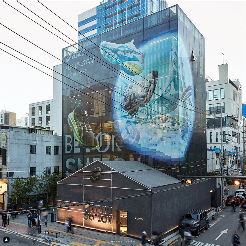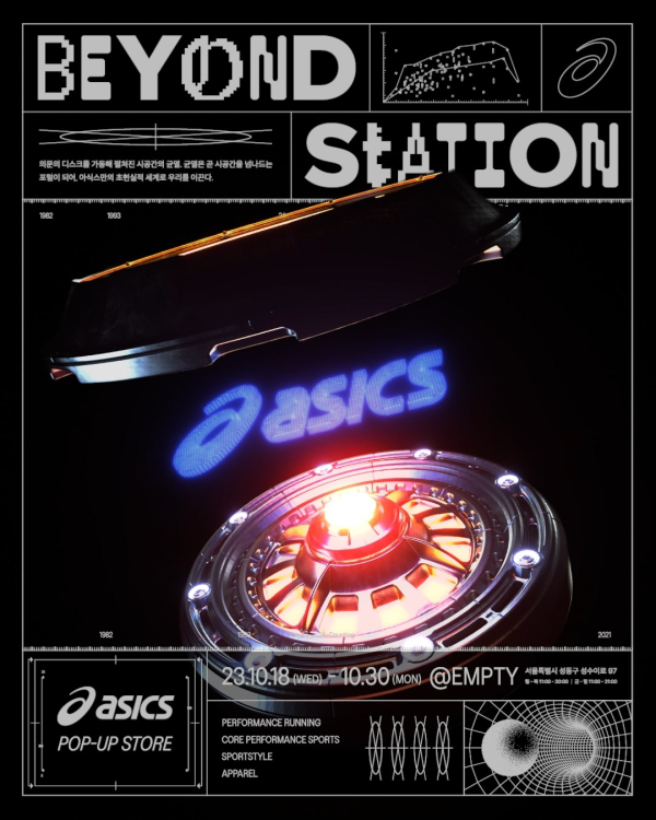 최근 Y2K 트렌드도 아식스의 유행에 영향을 끼쳤습니다. 1990~2000년대 스타일이 유행하고, 테니스 등의 스포츠 패션코드가 하나의 유행이 되며 전통 있는 브랜드인 아식스의 인기도 증가했거든요. 아웃도어 패션 스타일이 일상복이 되는 고프코어룩의 인기와 함께 호카, 살로몬 같은 운동화 브랜드도 인기를 얻고 있고요. 최근 아식스는 성수동에서 ‘BEYOND STATION’ 이라는 컨셉으로 대규모 팝업 행사를 열었고, 높은 호응을 받았습니다.