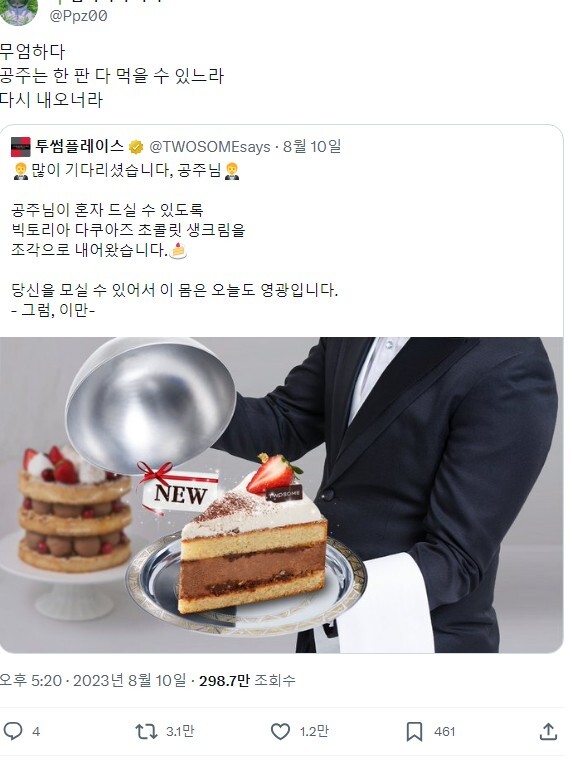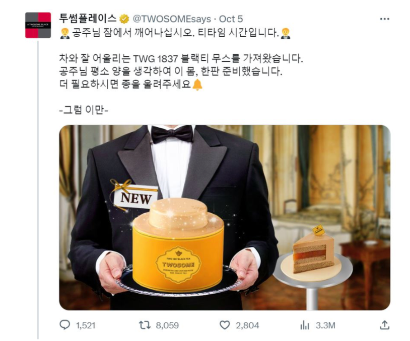 투썸플레이스가 가을 시즌 신메뉴로 티 브랜드 TWG와 콜라보한 블랙티 무스 케이크를 출시했는데요. 공주를 모시는 집사 콘셉트로 SNS에서 소비자들과 소통하는 모습이 큰 화제가 됐어요. 한번 살펴볼까요?