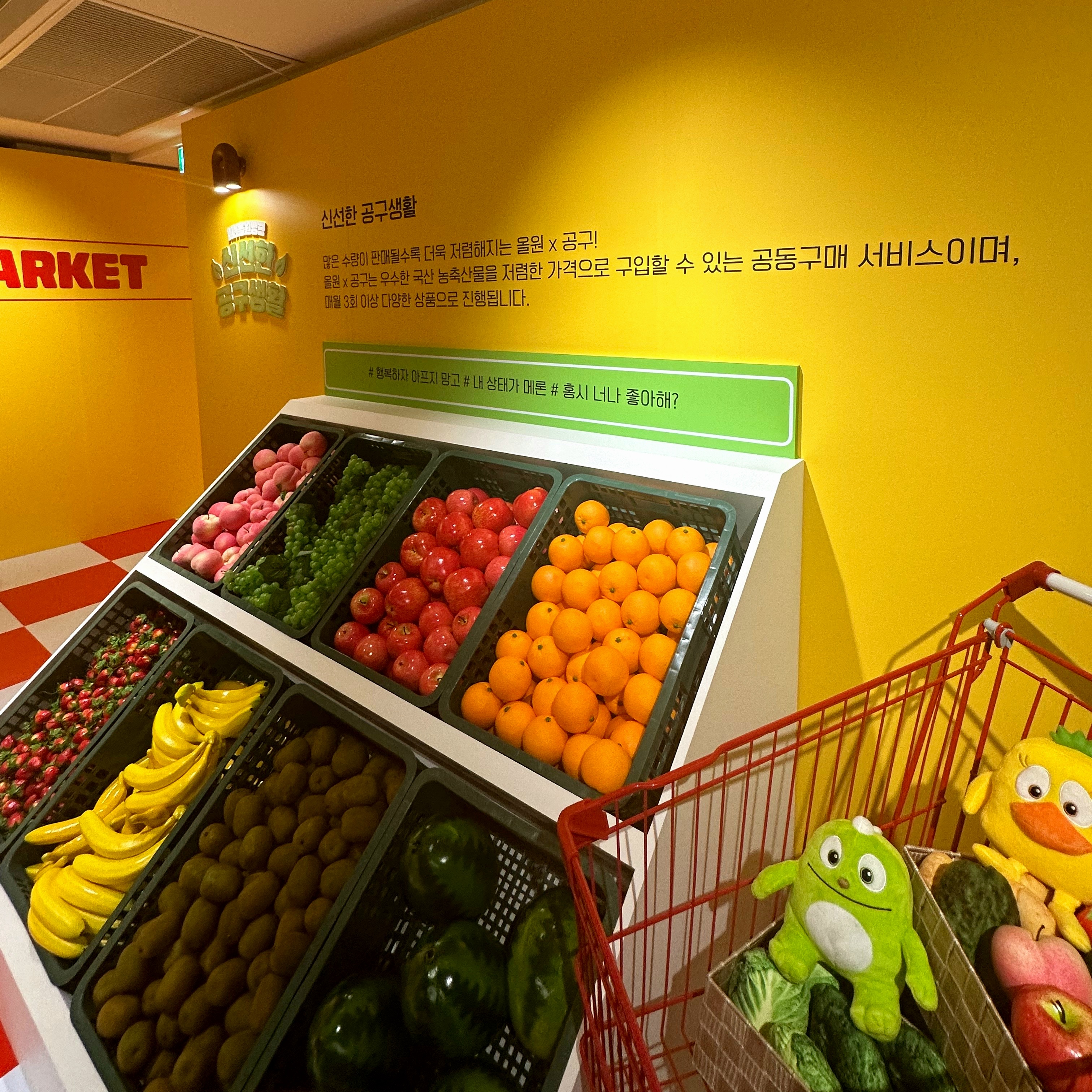 두 번째로 스탬프를 받을 수 있는 곳은 '신선한 공구생활'이었어요. NH 올원뱅크 앱을 통해서 다양한 농산물들을 공구할 수 있고요. 이곳의 스탬프 미션은 바구니에 담긴 단어 퍼즐을 푸는 거였어요. 뒤 쪽 바구니에 담긴 과일이 힌트였어요.