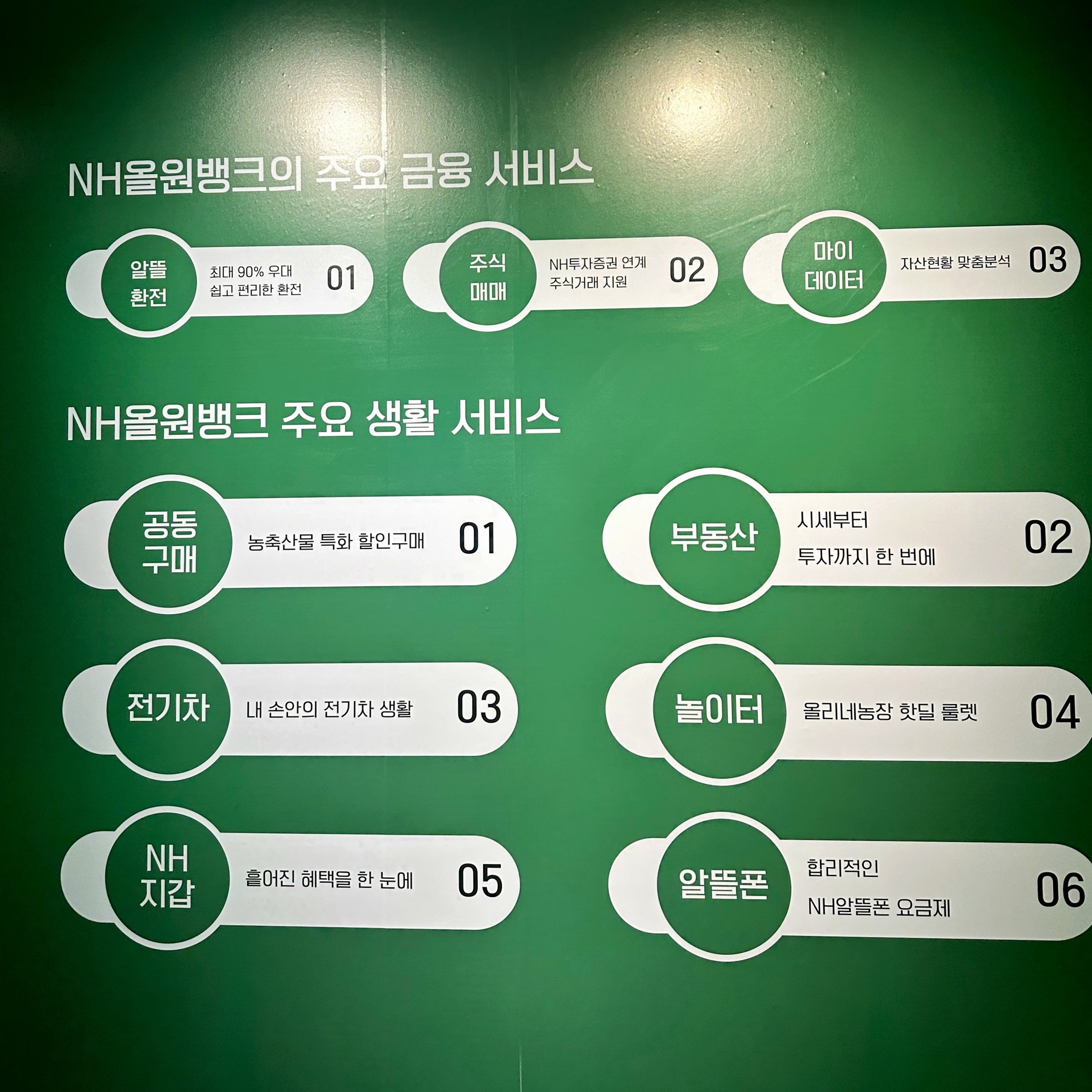 스탬프 찍는 체험을 하기 전에 'NH 올원뱅크' 앱이 어떤 서비스인지 잘 모르는 사람들을 위해서 주요 서비스들을 설명해 주는 공간이 있었어요.