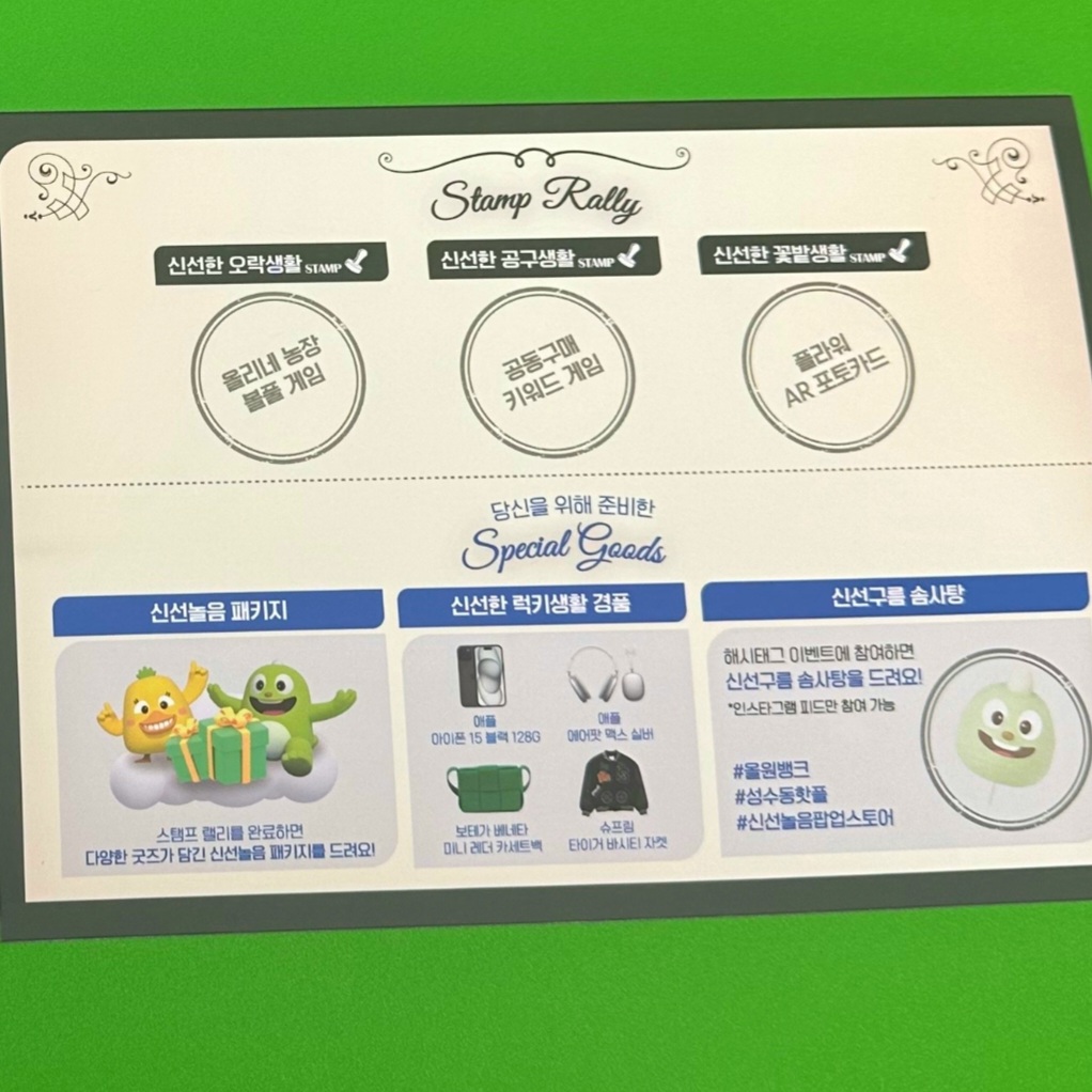 팝업스토어에 입장하고 나면 제일 먼저 템플릿을 받는데요. 템플릿에 적힌 체험을 모두 완수하고 스탬프를 받으면 '신선놀음 패키지' 굿즈세트를 선물로 받을 수 있었어요. 패키지 안에는 2024년 캘린더, 맥주잔, 씨앗키트가 들어있어요.