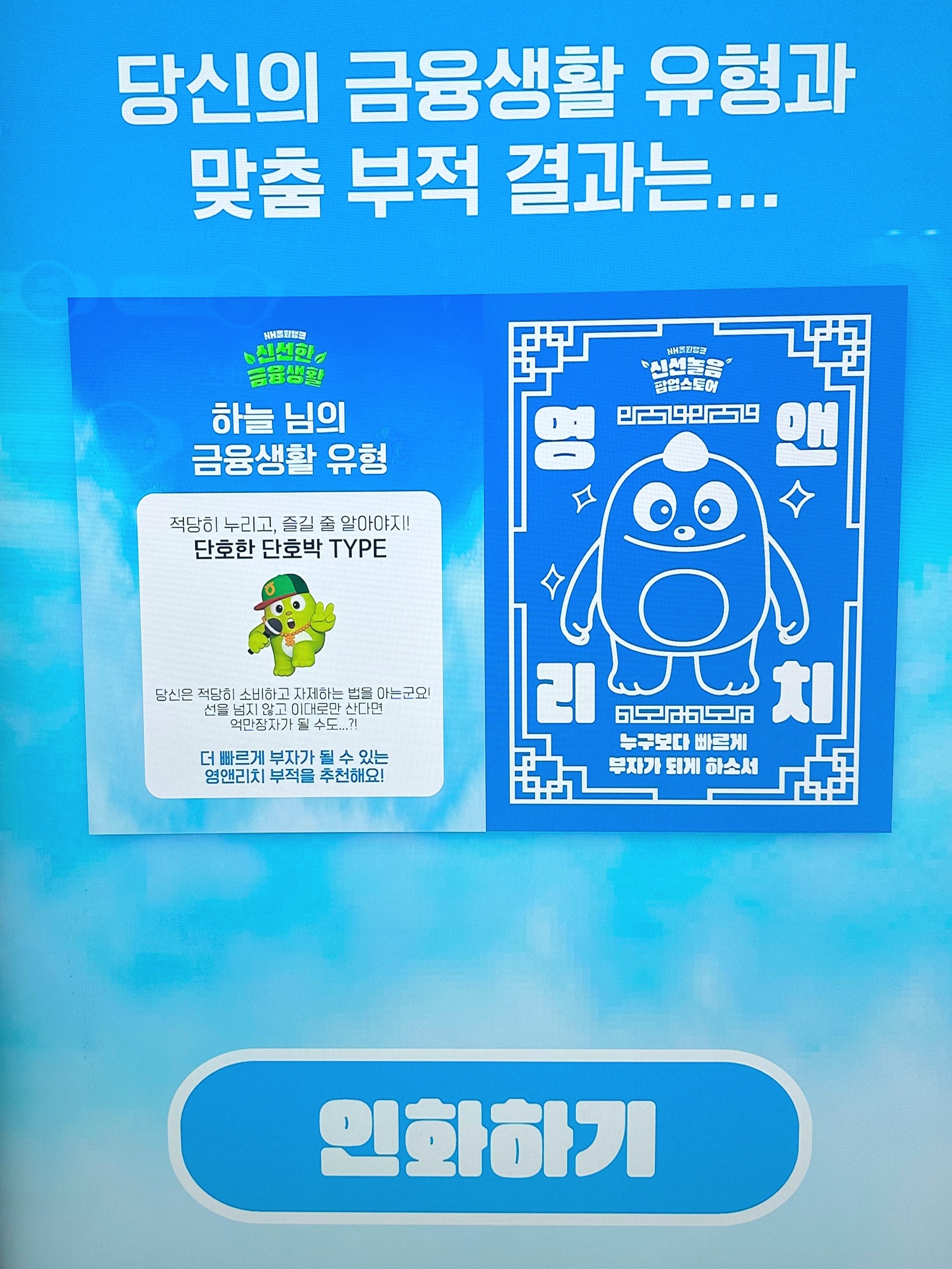 추가로 mbti처럼 간단하게 자신의 금융생활 유형을 알려주는 테스트 하는 곳이 있었는데요. 테스트를 마치고 나면 자신의 금융생활에 맞는 맞춤부적을 처방해 줬어요. 저는 '단호한 단호박' 타입이 나와서 영 앤 리치 부적을 받았네요.