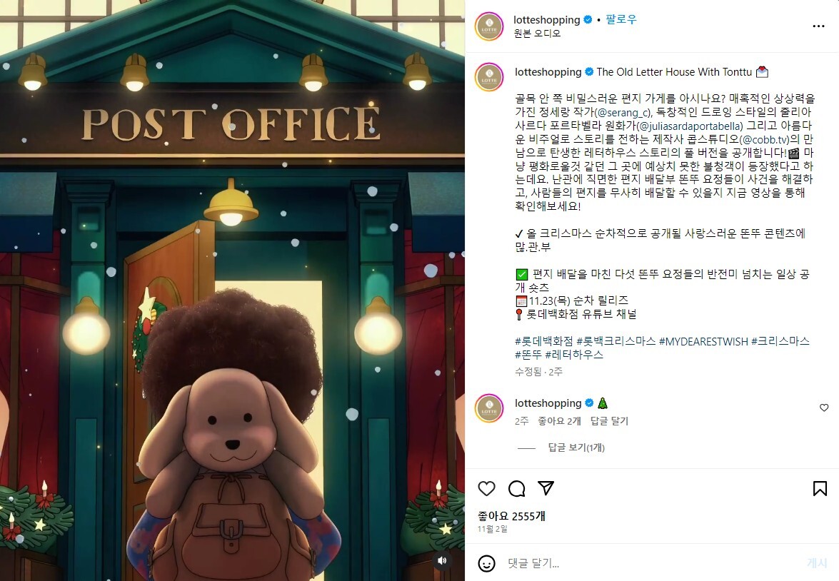 롯데백화점은 특히 인스타그램과 유튜브 채널을 적극적으로 활용해 마케팅을 진행하고 있습니다. '똔뚜' 편지배달부 요정들을 주인공으로 가슴 따뜻한 영상을 전달했고요. 정세랑 작가, 줄리아 사르다 포르타벨라 원화가, 제작사 콥스튜디오가 제작한 레터하우스의 영상이 인스타그램과 유튜브 채널을 통해 공개됐어요.