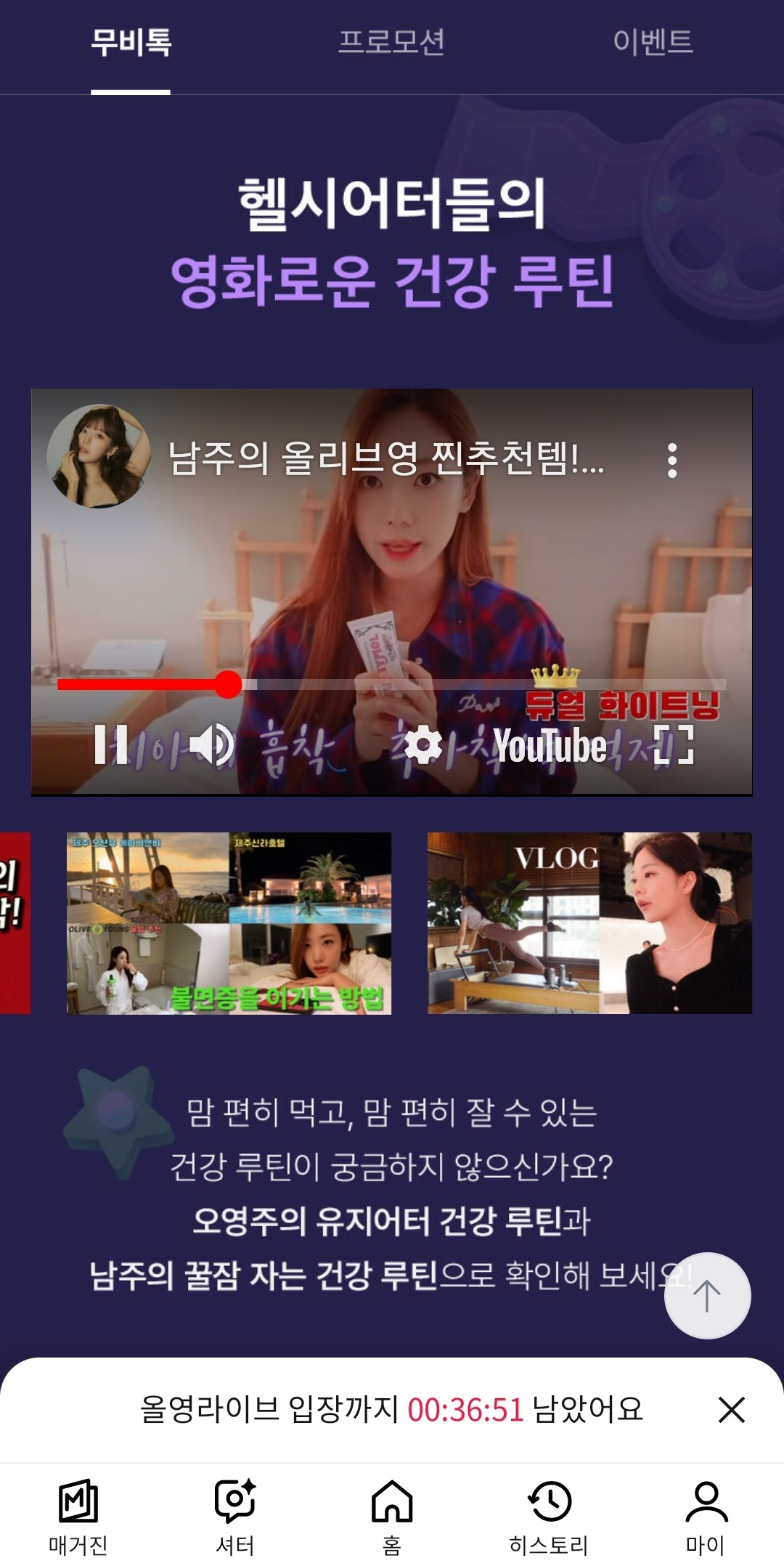 올리브영의 온라인몰에서도 헬시어터 캠페인은 이어집니다. 무비톡, 프로모션, 이벤트 3개의 코너로 진행 중인데요. 무비톡에서는 인플루언서들의 건강 루틴을 영상으로 보여주고, 프로모션에서는 선착순 기프트박스가, 이벤트 코너에서는 건강 루틴 상품 구매 시 응모 가능한 경품 행사를 진행합니다.