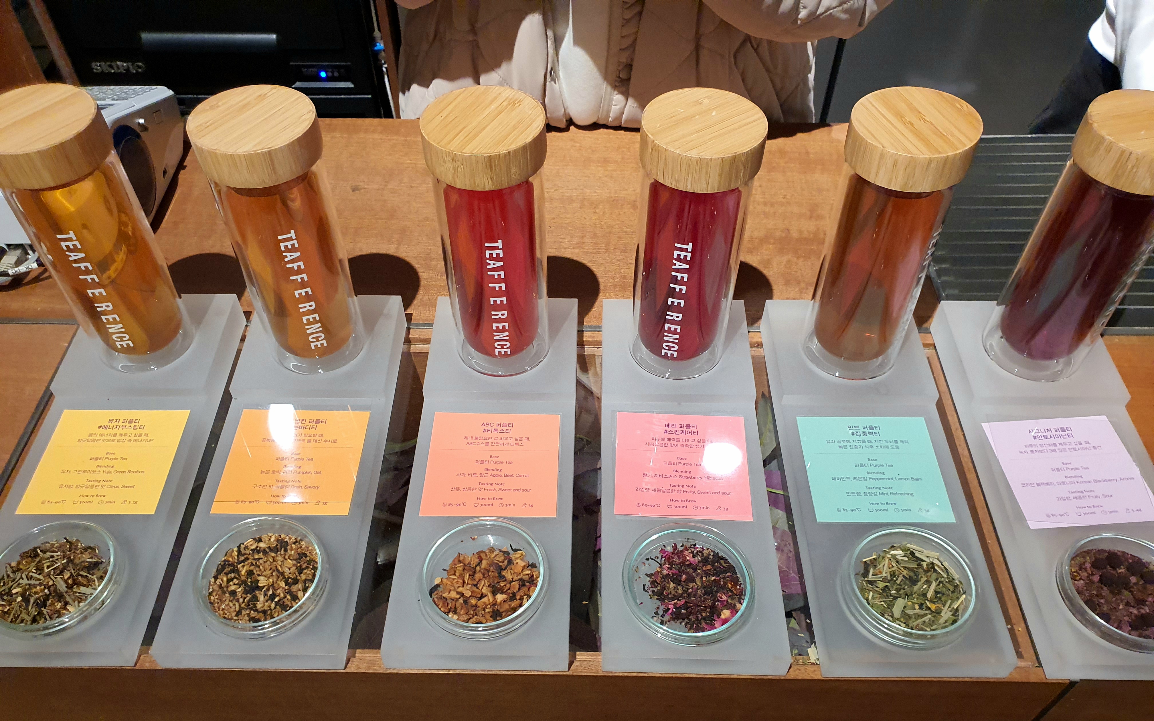 미각 티라피 존에서는 시그니처인 퍼플티를 맛보고, 퍼플티를 베이스로 응용한 다양한 티의 향기들도 맡아볼 수 있었어요. 퍼플티에는 카페인이 많이 들어있지 않아서 부담 없이 마실 수 있었고, 맛은 달짝지근한 맛이 났어요. 단맛이 너무 강하지 않아서 누구나 편하게 마실 수 있었어요.