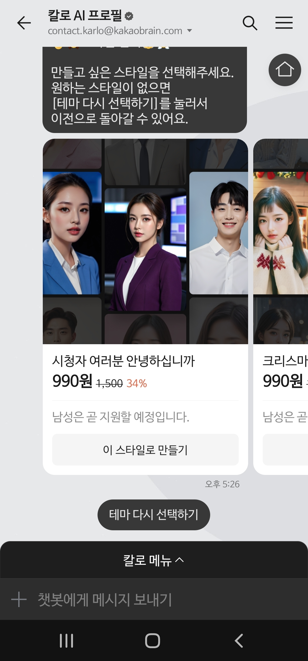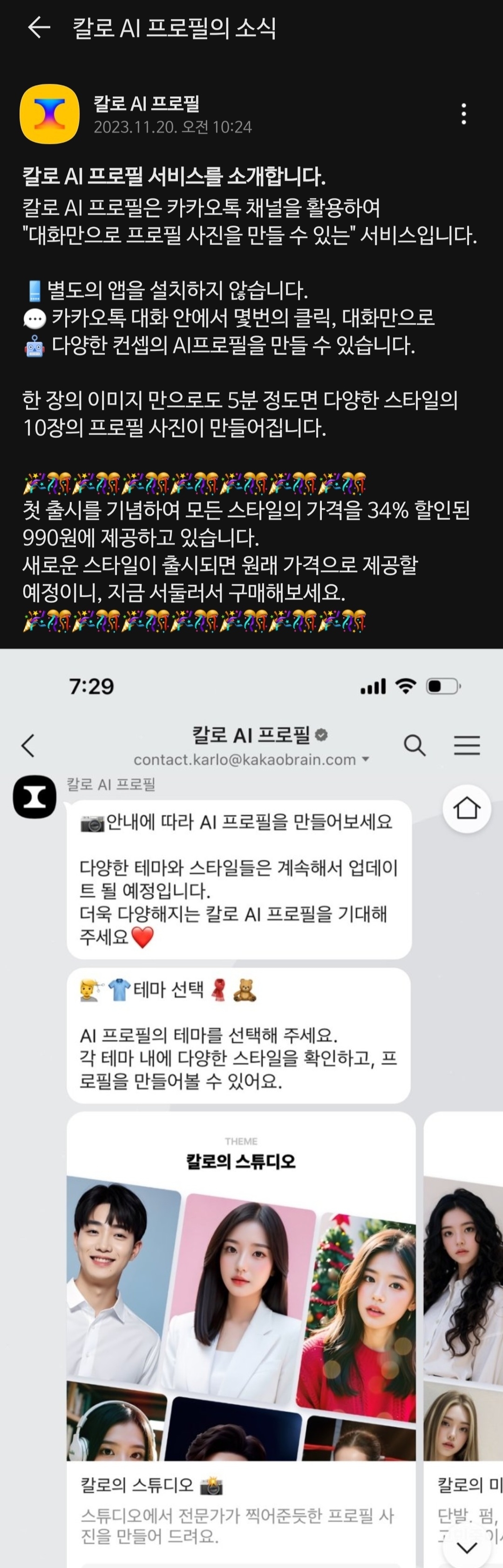 ✔️ 칼로 AI 프로필 서비스는 카카오브레인이 만든 이미지 생성 서비스로, 단돈 990원으로 이용 가능합니다.