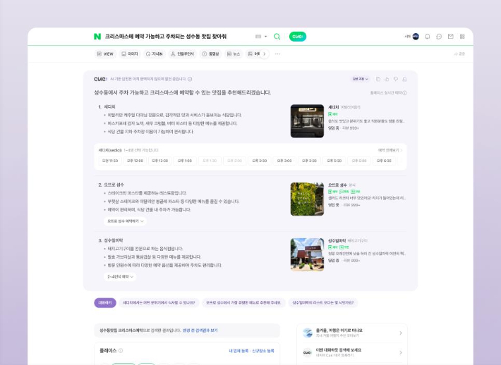 최근 AI가 글로벌 기업들에게 최대 화두인 만큼 네이버 역시 적극적으로 투자를 진행 중입니다. 네이버는 지난 9월 시범 출시했던 검색 특화 생성형 인공지능 서비스 '큐:'(CUE:)를 이번 달부터 포털 통합 검색에 적용했습니다. 챗GPT 처럼 구체적인 의도를 가진 대화형 질문에 데이터 베이스에 기반한 정보로 최신 답변을 제공하고, 쇼핑과 예약 등 네이버의 다양한 서비스를 연계했습니다. 하단 예시를 보면 "크리스마스에 예약, 주차되는 성수동 맛집 찾아줘"라고 질문했을 때 사용자가 원하는 조건에 맞는 장소가 결과에 뜨는 것을 확인할 수 있죠.