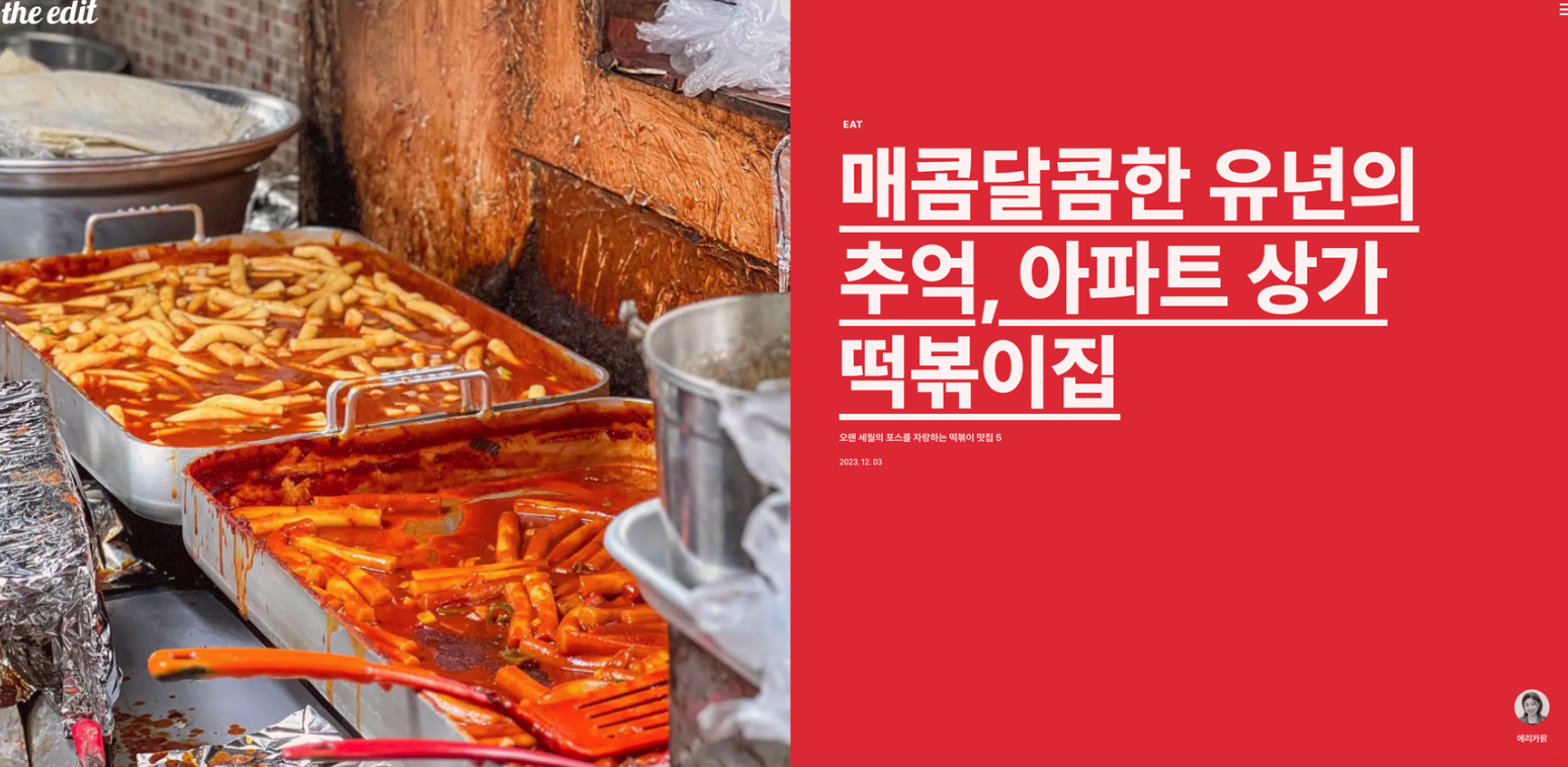 이번 리뉴얼에서 가장 눈에 띄는 부분은 마치 ‘종이 잡지’처럼 홈페이지를 구현했다는 건데요. 왼쪽과 오른쪽 화면을 나누어, 한쪽 면을 이미지로 가득 채우고 제목과 에디터 이름을 넣었어요. 그리고 다른 한쪽에는 다른 글 목록을 스크롤로 내릴 수 있도록 디자인했고요. 페이지마다 새로운 디자인을 마주할 수 있는 잡지처럼 글마다 어울리는 배경색도 다르게 만들었습니다. 떡볶이집을 소개하는 글은 빨간색 배경으로 활용하는 것처럼요.