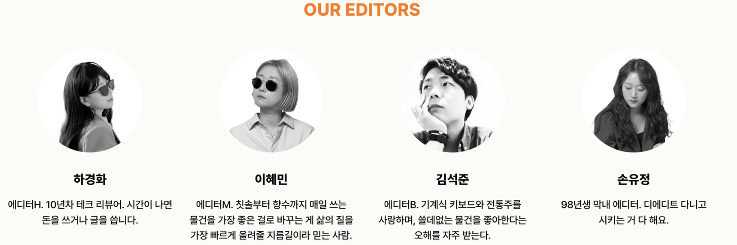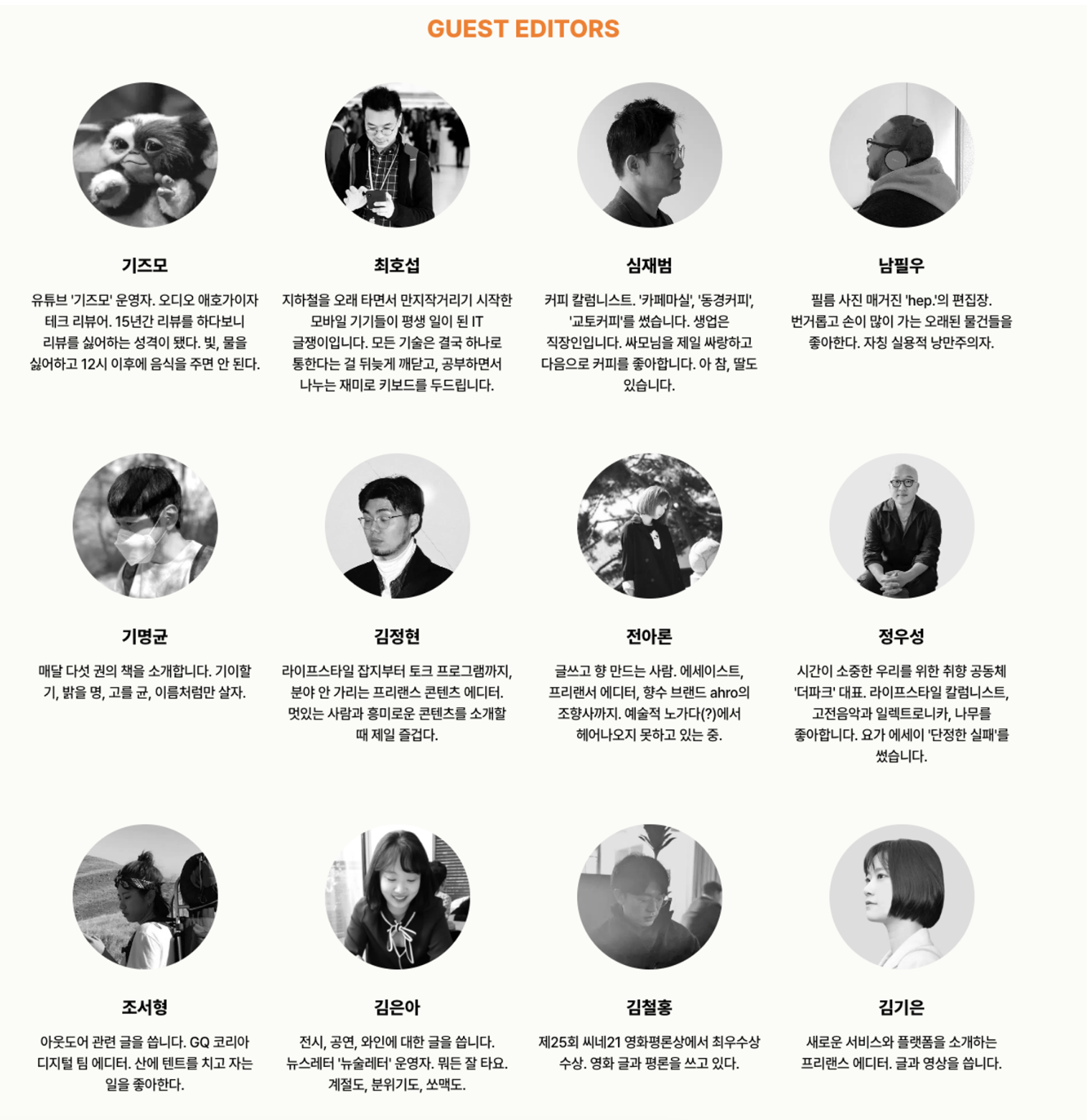 또 글의 메인 화면에 에디터의 이름과 사진을 노출했습니다. 디에디트의 기조 중 하나가 바로 에디터를 강조하는 것인데, 글도 중요하지만 그 글을 누가 썼는지도 강조하기 위해 이렇게 UI를 바꿨다고 해요. 디에디트는 4명의 소속 에디터들과 25명의 외부 필진들로 구성되어 있어요.