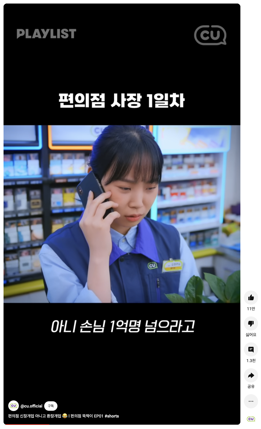 두 브랜드가 롱폼 영상 잘하기로 소문이 났다면, 24시 편의점 CU는 숏폼 영상으로 많은 인기를 얻었어요. CU의 유튜브 공식 계정 CU [씨유튜브](@cu.official)는 ‘편의점 고인물’, ‘편의점 뚝딱이’, ‘편의점 베짱이’의 숏폼 시트콤 시리즈로 신규 구독자 약 20만 명을 모았는데요. 편의점에서 벌어지는 에피소드를 유쾌하게 풀어내고 있어요.