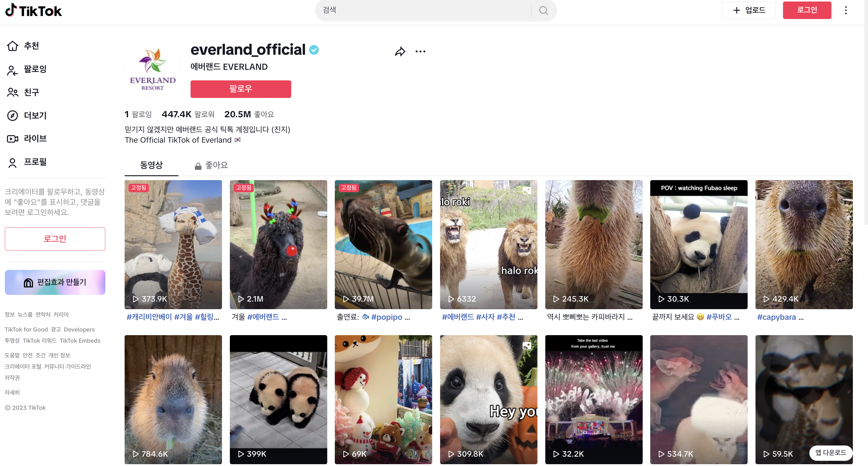 푸바오는 올해 치명적인 귀여움으로 많은 이의 마음을 사로잡았는데요. 에버랜드의 틱톡 공식 계정(everland_official)이 푸바오의 인기에 크게 일조했다고 할 수 있어요. 틱톡 에버랜드 채널에는 사파리 동물 친구들의 모습과 각종 굿즈 소개, 직원들의 일상 등이 숏폼 영상으로 업로드되는데요. 특히 동물 친구들의 챌린지 영상은 많은 사랑을 받고 있어요. 에버랜드는 센스 있는 댓글, 트렌드를 반영한 영상 등을 통해 시청자와 깊은 유대감도 쌓고 있어요.