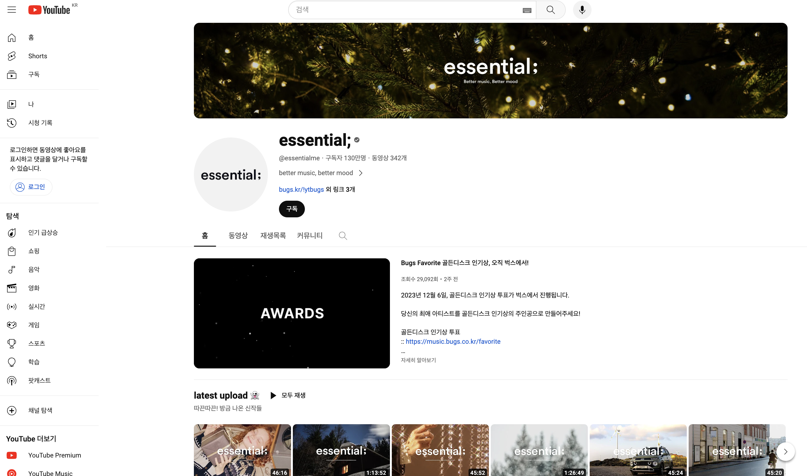 토스가 머니그라피에서 ‘토스’를 전면에 드러내지 않은 것처럼, 음악 포털 서비스 ‘벅스’도 한발 물러나 유튜브 계정 essential(@essentialme)을 운영하고 있어요. essential은 벅스 뮤직 PD의 앨범 소개 컨셉으로, 음악 플레이리스트를 롱폼 영상 콘텐츠로 제공해요. 선곡 맛집으로 소문난 essential은 음악 포털 서비스로서의 전문성을 브랜드에 부여합니다.