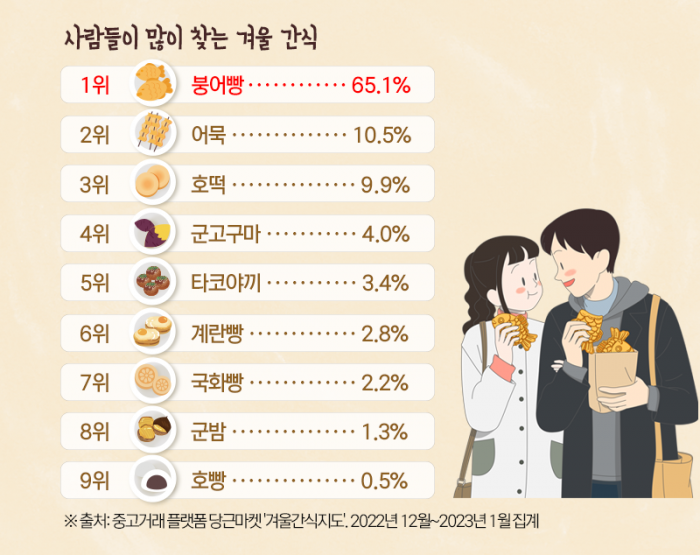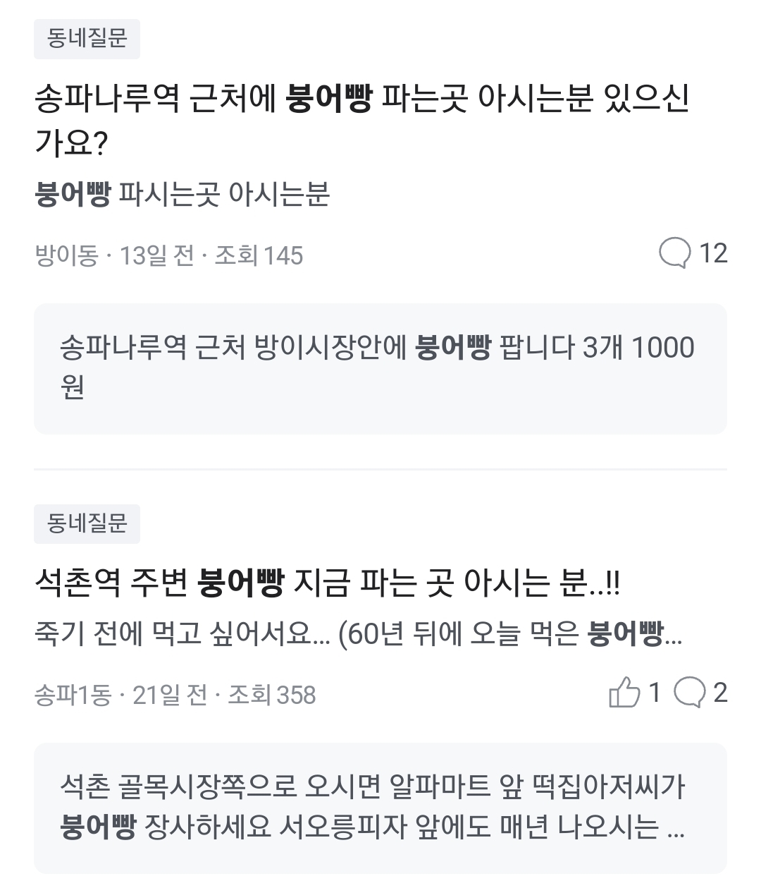 ✔️ 길거리 붕어빵의 위치를 공유하는 '가슴속3천원', '붕세권'이라는 어플들이 인기를 얻었어요.