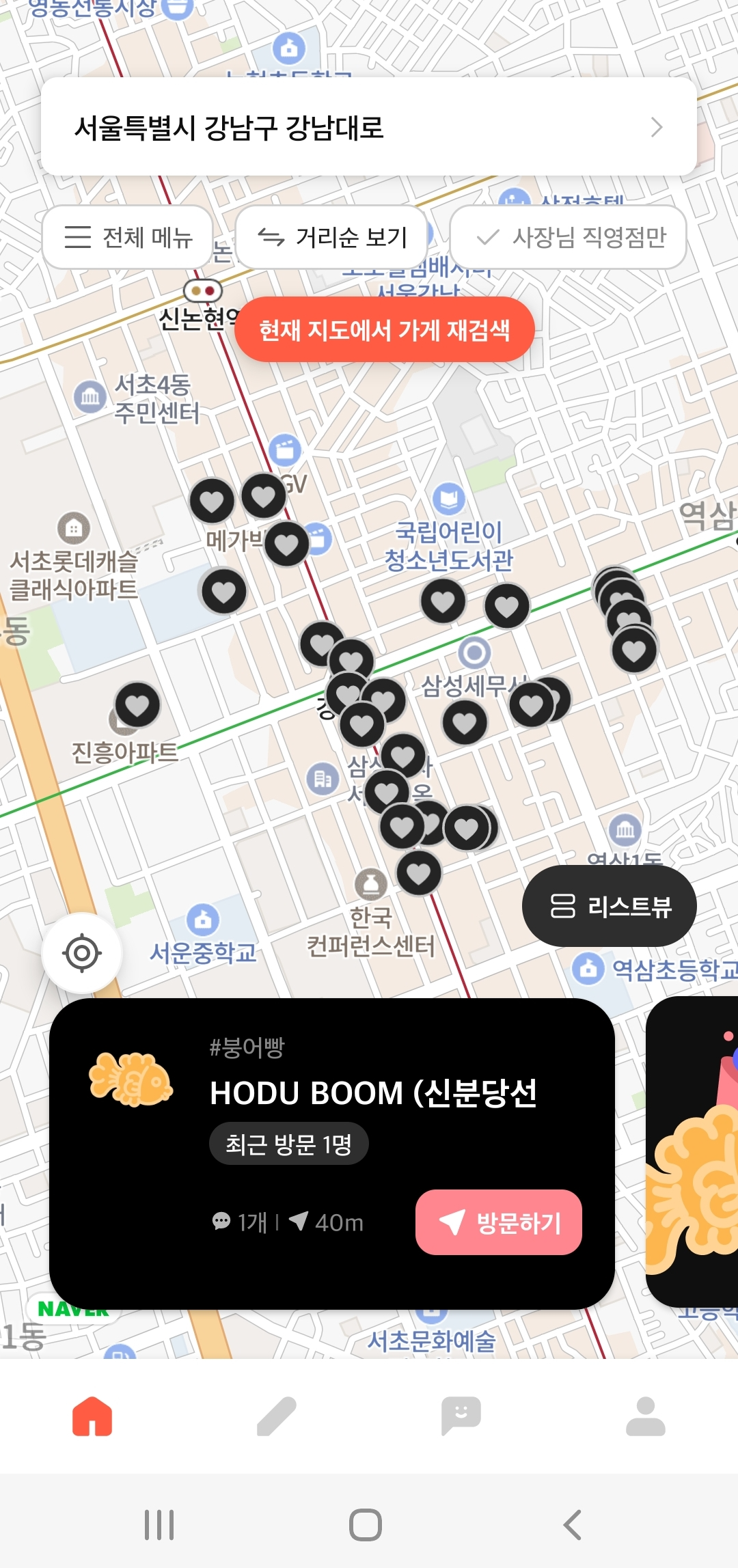 '가슴속3천원' 이란 어플은 약 3천 원 정도로 사 먹을 수 있는 길거리 음식 정보를 공유하는 앱인데요. 특히 붕어빵 노점상의 위치를 공유하는 경우가 많아요. 사용자들이 직접 붕어빵 파는 곳을 입력하면 지도에 표시되고, 내가 현재 있는 곳 근처에 붕어빵 가게가 얼마나 있는지도 알려줍니다. 심지어 몇 시에 문을 열고 닫는지까지 표시되는데요. '붕세권'이라는 어플리케이션 역시 비슷한 기능을 선보여요.