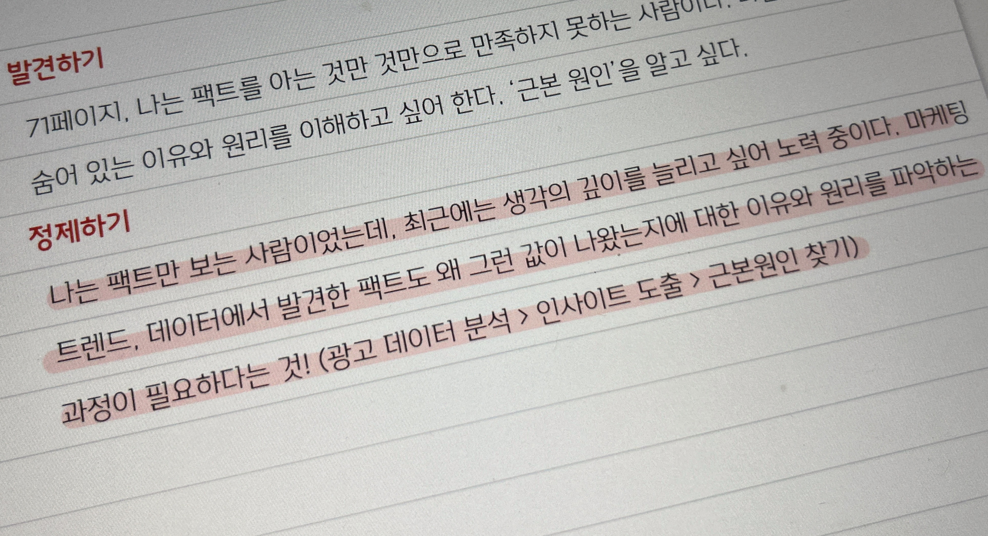 옮겨 적은 문장 바로 아래에 배울 점이나 느꼈던 점, 떠오르는 생각을 함께 적는 것이 중요한데요. 이렇게 하면 책의 내용을 그대로 받아들이는 것이 아니라 머릿속에서 정제 과정을 거치기 때문에 기억에도 오래 남고, 실제 업무에 적용시키기도 유용해요.