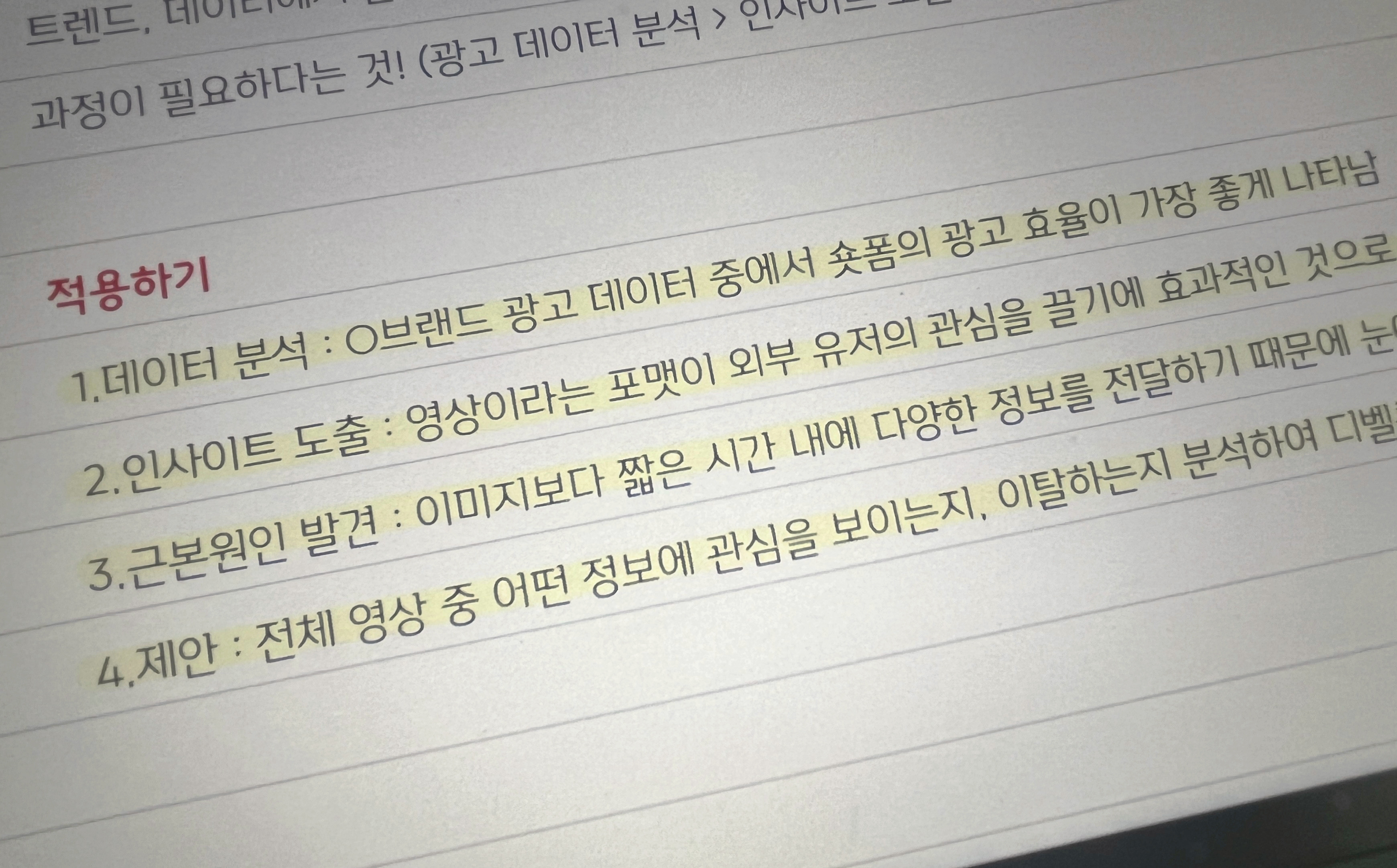 책을 통해 무언가를 배우고 느꼈다면, 그다음에는 적용시키기 위한 방법을 구체화해야 합니다. 노트에 적은 내용과 인사이트를 업무에 어떻게 활용할 수 있을지 고민해 보고 함께 적어 보세요. 이때, 디테일하게 생각해 볼수록 업무에 적용시키기 수월하기 때문에 어떻게 접근할지, 어떤 문구를 사용할지 등 구체적인 실행안도 미리 생각해 보면 유용해요.