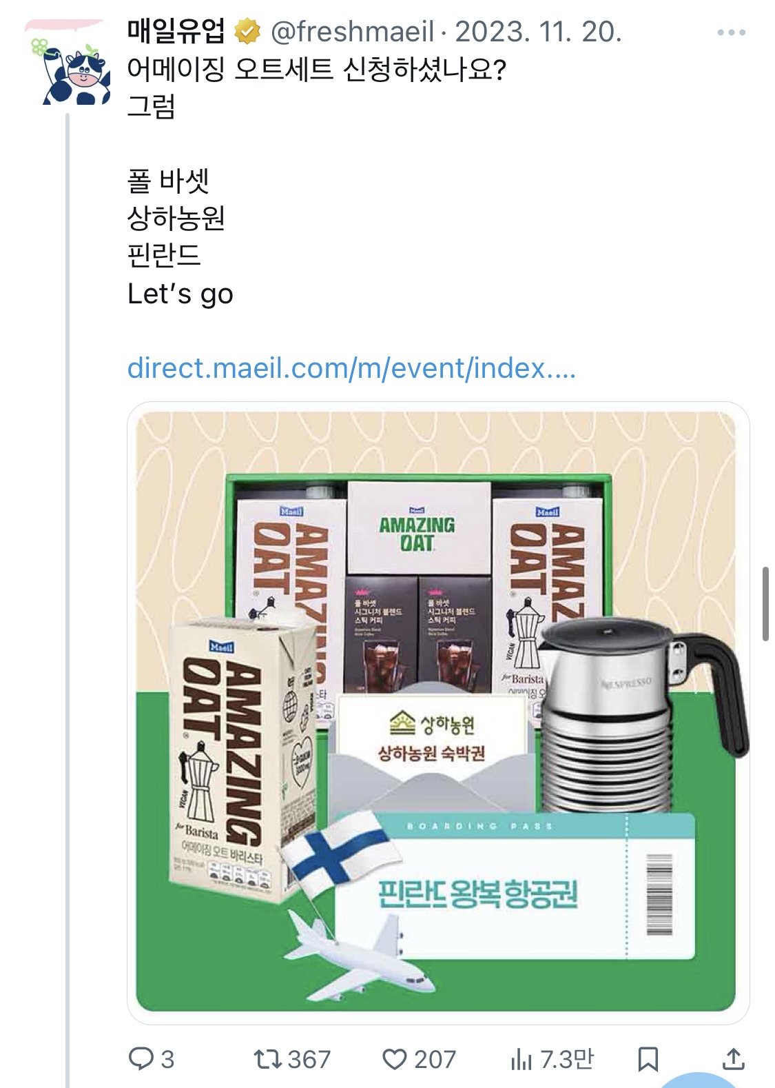 유제품 전문 브랜드 매일유업의 엑스 계정은 채널 특유의 문법을 성실히 따르는 모습을 보여줘요. 엑스는 짙은 익명성과 확산력으로 밈과 드립의 활용이 다른 채널보다 활발해요. 매일유업은 신제품 소개, 프로모션 소식 등의 게시물에 과하지 않은 밈과 적절한 드립을 사용해 엑스 사용자에게 브랜드가 아닌 트위터리안(엑스 사용자 집단을 칭하는 용어)이 되어 친근하게 다가가요. 매일유업의 엑스 계정은 채널 기능과 사용자 특성에 대한 이해도가 채널 내 소비자와의 커뮤니케이션과 유대감 형성에 얼마나 중요한지 잘 보여줍니다.