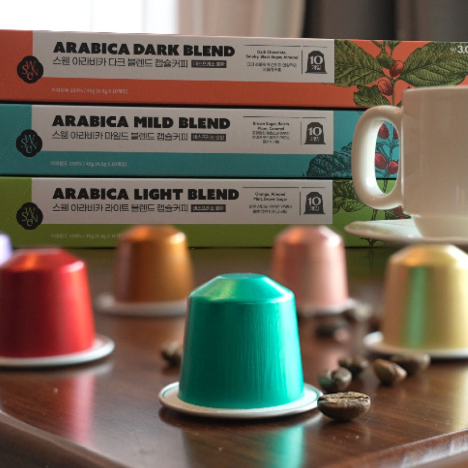 다이소가 이번엔 ‘스웬 캡슐커피’라는 제품을 내놓으며 캡슐커피 시장까지 진출했습니다. 다이소 캡슐커피는 '게이샤 블렌드'와 '아라비카 블렌드' 2가지인데요. 콜롬비아, 과테말라, 에티오피아 또는 라이트, 마일드, 다크 등으로 다양한 맛을 선택할 수 있어요. '게이샤 블렌드'가 캡슐 10개에 5000원이고, '아라비카 블렌드'는 캡슐 10개에 3000원으로 1개당 300~500원이라 타사 제품보다 60%가량 저렴합니다.