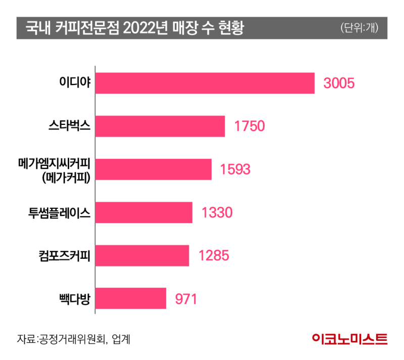 최근 커피 소비 트렌드가 양극화되면서 메가커피, 컴포즈커피 같은 저가 프랜차이즈 브랜드가 인기를 얻고 있습니다. 매장수만 놓고 본다면 이디야, 메가커피, 컴포즈커피 3사가 치열한 경쟁을 벌이고 있는데요. 이디야는 지난 2001년 1호점을 오픈한 이후 공격적으로 매장을 늘려, 2022년 기준으로 국내 커피전문점 중 가장 많은 매장을 가진 브랜드로 꼽혔어요. 메가커피 매장수도 무서운 속도로 많아지고 있는데요. 2020년 1,184개에서 2023년 2월 2일 기준 2,241개로 폭발적으로 증가했어요. 컴포즈커피 역시 최근에 급성장하면서 1,285개의 매장을 보유하고 있었고요.