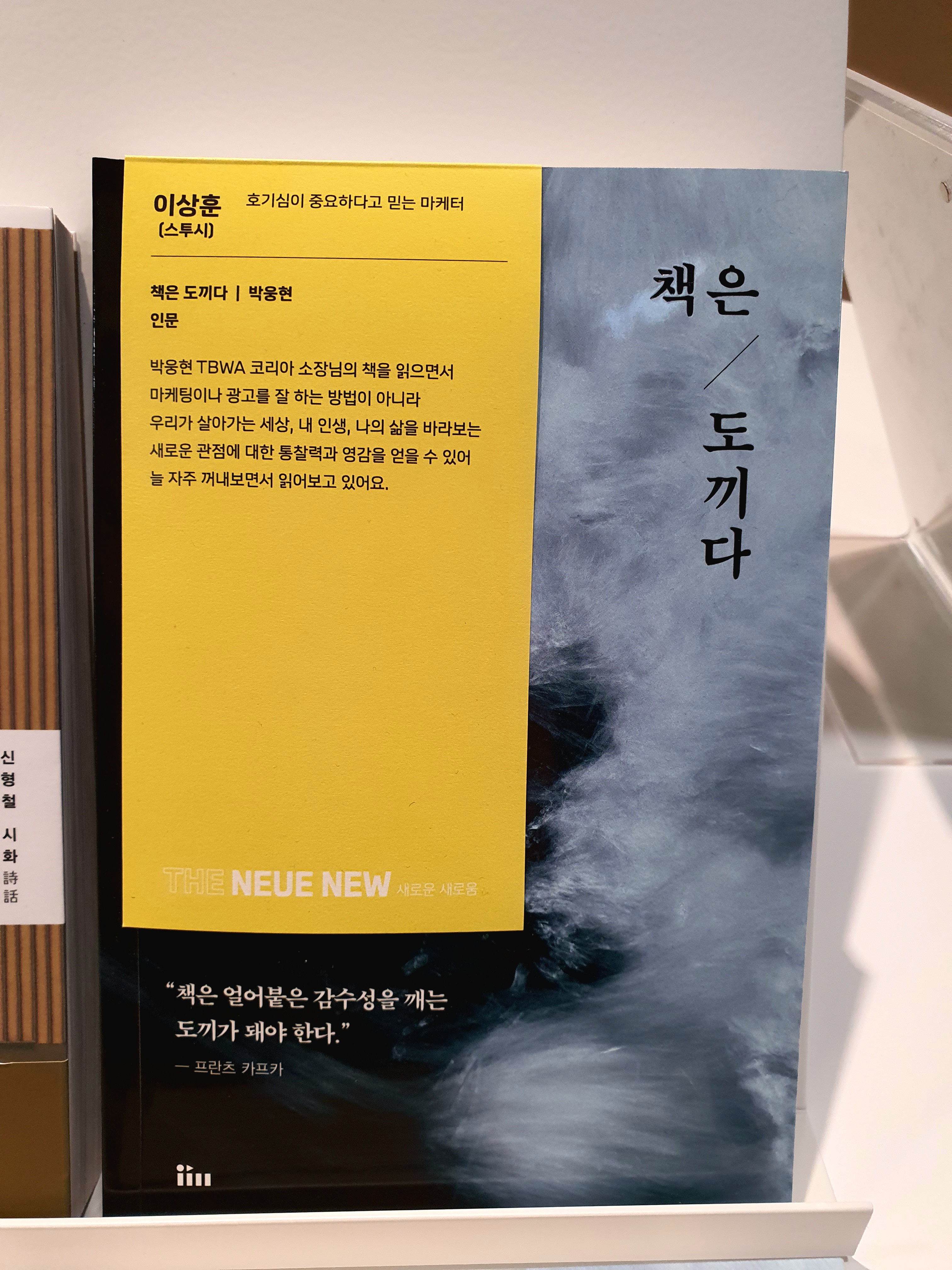 107인이 생각한 새로움과 영감을 주는 책을 분야별로 큐레이팅 해놓은 공간도 있었어요. 고전부터 인문, 과학, 자기 계발까지 다양한 장르가 있더라고요.