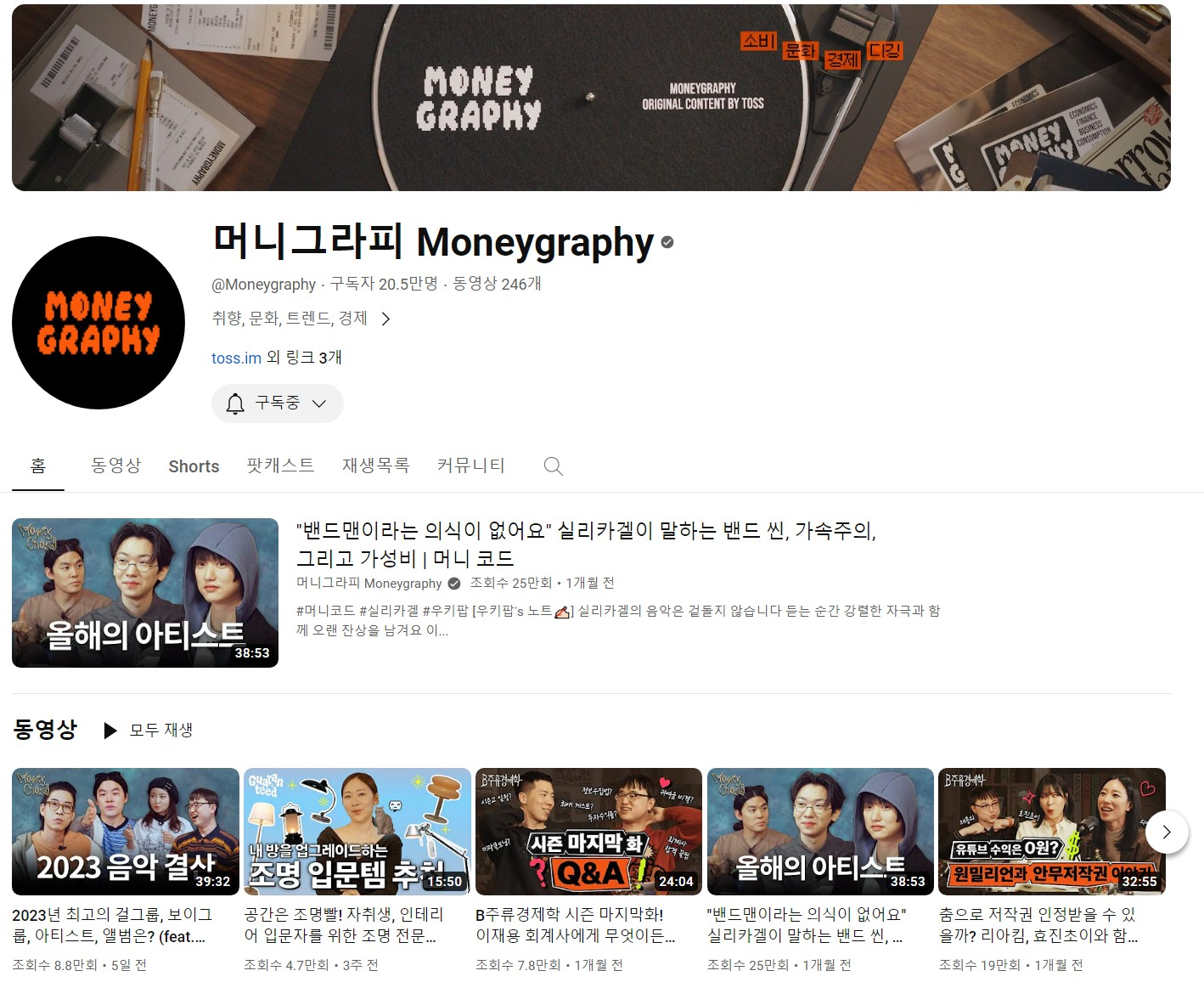 머니그라피는 토스의 오리지널 콘텐츠를 다루는 유튜브 채널인데요. '머니 코드: 우키팝과 함께하는 음악-산업 인터뷰', '개런티드: 취향 좋은 친구들의 소비 가이드', 'B주류경제학: 소비문화 디깅 토크쇼'라는 3개의 코너에서 일상 속 금융 이야기를 다루고 있어요.