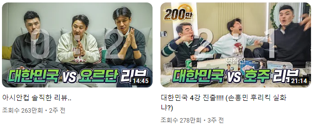 리액션, 리뷰 영상은 스포츠, 게임, 케이팝 처럼 사람들이 열광하는 오락, 엔터테인먼트 분야에서도 인기를 끌고 있어요. 전 국가대표 축구 선수 이천수가 이번 아시안컵 경기를 보며 찍은 리액션과 경기 내용 리뷰 영상도 비슷한 예시입니다. 시청자들은 콘텐츠를 보고 느낀 감정을 서로 공유하고, 하고 싶었던 말을 속 시원하게 대신 해주는 콘텐츠를 찾고 있어요. 다른 사람들과 함께 콘텐츠를 즐기고 싶어하는 '공감 욕구’가 바탕에 깔린 거죠.