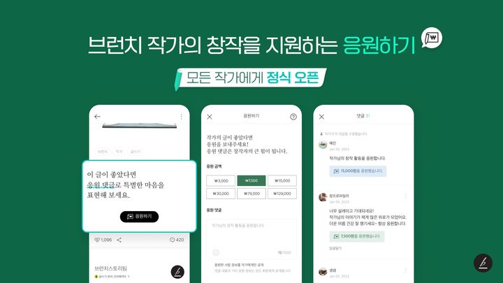 카카오가 운영하는 블로그 플랫폼 '브런치스토리'가 크리에이터들의 창작 활동을 지원하기 위해 나섰어요. '응원하기' 모델이라는 새로운 수익 창출 방법을 도입한 건데요. 이 모델은 독자들이 작가의 글에 응원 댓글과 함께 후원금을 보낼 수 있는 방식이에요.