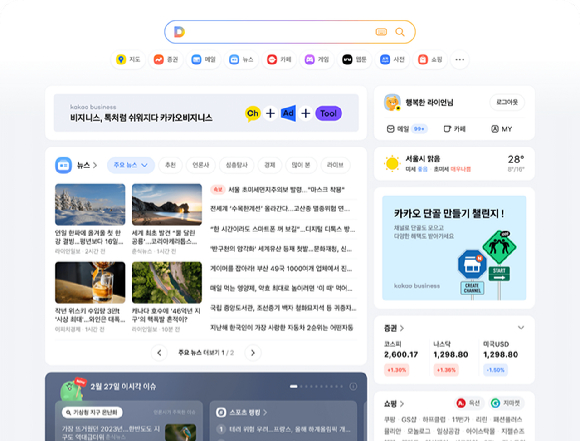 카카오가 운영하는 포털사이트 '다음'이 7년 만에 PC화면을 개편했어요. 먼저 검색창 하단에 주요 서비스 아이콘을 배치해서 지도, 증권, 메일, 뉴스 등의 서비스가 사용자에게 더 직관적으로 다가갈 수 있도록 설계되었죠. 또 '이 시각 이슈' 영역을 만들어서 실시간으로 주목받고 있는 화제를 한눈에 볼 수 있게 했어요. 이외에도 숏폼 영상을 볼 수 있는 '오늘의 숏' 코너가 있고요. 카카오톡과 연동된 톡캘린더와 톡서랍을 'MY' 탭에서 이용할 수 있게 되었어요. 원하는 크기에 맞게 화면 배율을 조정하거나 라이트모드·다크모드로 화면 스타일을 변경할 수도 있어요.