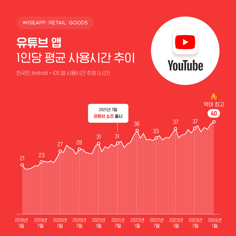 ✔️ 지난 1월, 1인당 유튜브 평균 사용시간이 역대 최대치를 기록했어요. 이용 시간뿐만 아니라 검색시장에서도 입지를 크게 넓혀가고 있고요.