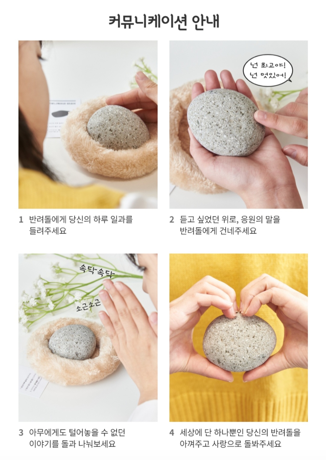 제품 구성에 포함된 마카펜으로 직접 반려돌의 표정을 그리거나 데코를 할 수 있고, 반려돌 등록증에는 반려돌의 이름과 MBTI, 반려자 등도 적을 수 있게 구성하였어요. 반려돌과의 커뮤니케이션 가이드까지 제공해 마치 반려돌이 실제로 살아있는 것 같이 느끼게 하죠.