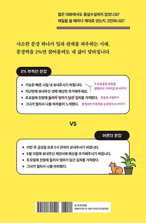 <어른의 문장력>은 일상의 문장을 깔끔하고 호감 가게 쓰는 작은 법칙들을 담고 있어요. 단순히 방법을 나열하기보다는 일화 중심으로 설명하고 있어 초보 마케터도 쉽게 이해하고 적용해 볼 수 있어요. 문장의 기본 원칙부터 어른의 문장을 쓰는 구체적인 방법, 플랫폼 특성을 고려한 작문법 등을 책 전반에 걸쳐 소개합니다.