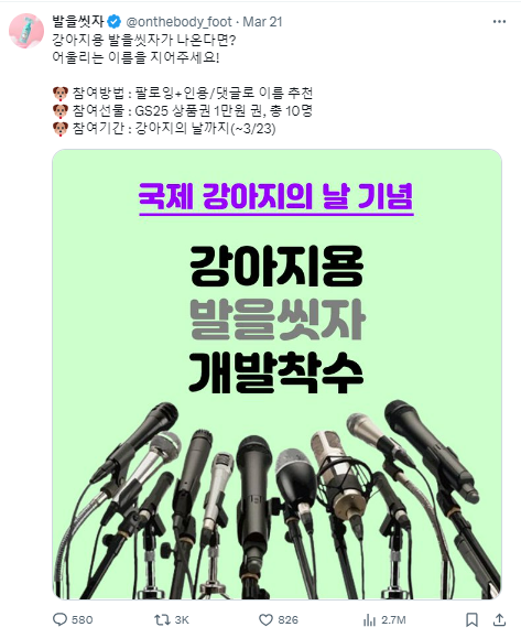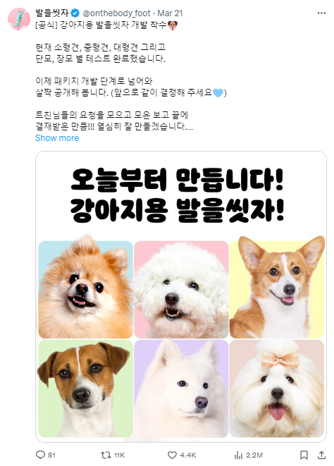 또한 최근에는 3월 23일 '국제 강아지의 날'을 맞이하여 강아지용 발을씻자 제품 개발에 착수했음을 밝히기도 했어요. 이 역시 엑스에서 구독자들로부터 꾸준히 있었던 요청으로 만들어졌고, 제품 개발 소식을 국제 강아지의 날을 통해 더 효과적으로 전달했어요. 이후 패키지 개발 단계에서도 구독자들과 함께 결정하여 만들어질 것을 강조하며, 제품 이름 콘테스트도 열렸죠.